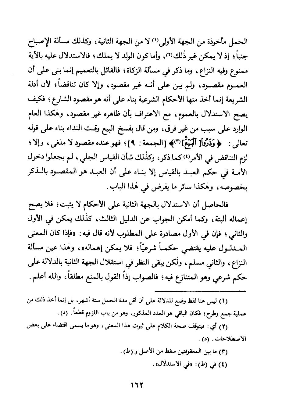 الحمل مأخوذة مِنَ الْجِهَةِ الْأُولَى1 لَا مِنَ الْجِهَةِ الثَّانِيَةِ، وَكَذَلِكَ مَسْأَلَةُ الْإِصْبَاحِ جُنُبًا، إِذْ لَا يُمْكِنُ غَيْرُ ذَلِكَ2، وَأَمَّا كَوْنُ الْوَلَدِ لَا يُمْلَكُ، فَالِاسْتِدْلَالُ عَلَيْهِ بِالْآيَةِ مَمْنُوعٌ وَفِيهِ النِّزَاعُ، وَمَا ذُكِرَ فِي مَسْأَلَةِ الزَّكَاةِ، فَالْقَائِلُ بِالتَّعْمِيمِ إِنَّمَا بَنَى عَلَى أَنَّ الْعُمُومَ مَقْصُودٌ، وَلَمْ يَبْنِ عَلَى أَنَّهُ غَيْرُ مَقْصُودٍ، وَإِلَّا كَانَ تَنَاقُضًا، لِأَنَّ أَدِلَّةَ الشَّرِيعَةِ إِنَّمَا أُخِذَ مِنْهَا الْأَحْكَامُ الشَّرْعِيَّةُ بِنَاءً عَلَى أَنَّهُ هُوَ مَقْصُودُ الشَّارِعِ، فَكَيْفَ يَصِحُّ الِاسْتِدْلَالُ بِالْعُمُومِ، مَعَ الِاعْتِرَافِ بِأَنَّ ظَاهِرَهُ غَيْرُ مَقْصُودٍ، وَهَكَذَا الْعَامُّ الْوَارِدُ عَلَى سَبَبٍ مِنْ غَيْرِ فَرْقٍ، وَمَنْ قَالَ بِفَسْخِ الْبَيْعِ وَقْتَ النِّدَاءِ بِنَاءً عَلَى قَوْلِهِ تَعَالَى: {وَذَرُوا الْبَيْعَ} 3 [الْجُمُعَةِ: 9] ، فَهُوَ عِنْدُهُ مَقْصُودٌ لَا مُلْغًى، وَإِلَّا، لَزِمَ التَّنَاقُضُ فِي الْأَمْرِ4 كَمَا ذُكِرَ، وَكَذَلِكَ شَأْنُ الْقِيَاسِ الْجَلِيِّ، لَمْ يَجْعَلُوا دُخُولَ الْأَمَةِ فِي حُكْمِ الْعَبْدِ بِالْقِيَاسِ إِلَّا بِنَاءً عَلَى أَنَّ الْعَبْدَ هُوَ الْمَقْصُودُ بِالذِّكْرِ بِخُصُوصِهِ، وَهَكَذَا سَائِرُ مَا يُفْرَضُ فِي هَذَا الْبَابِ.