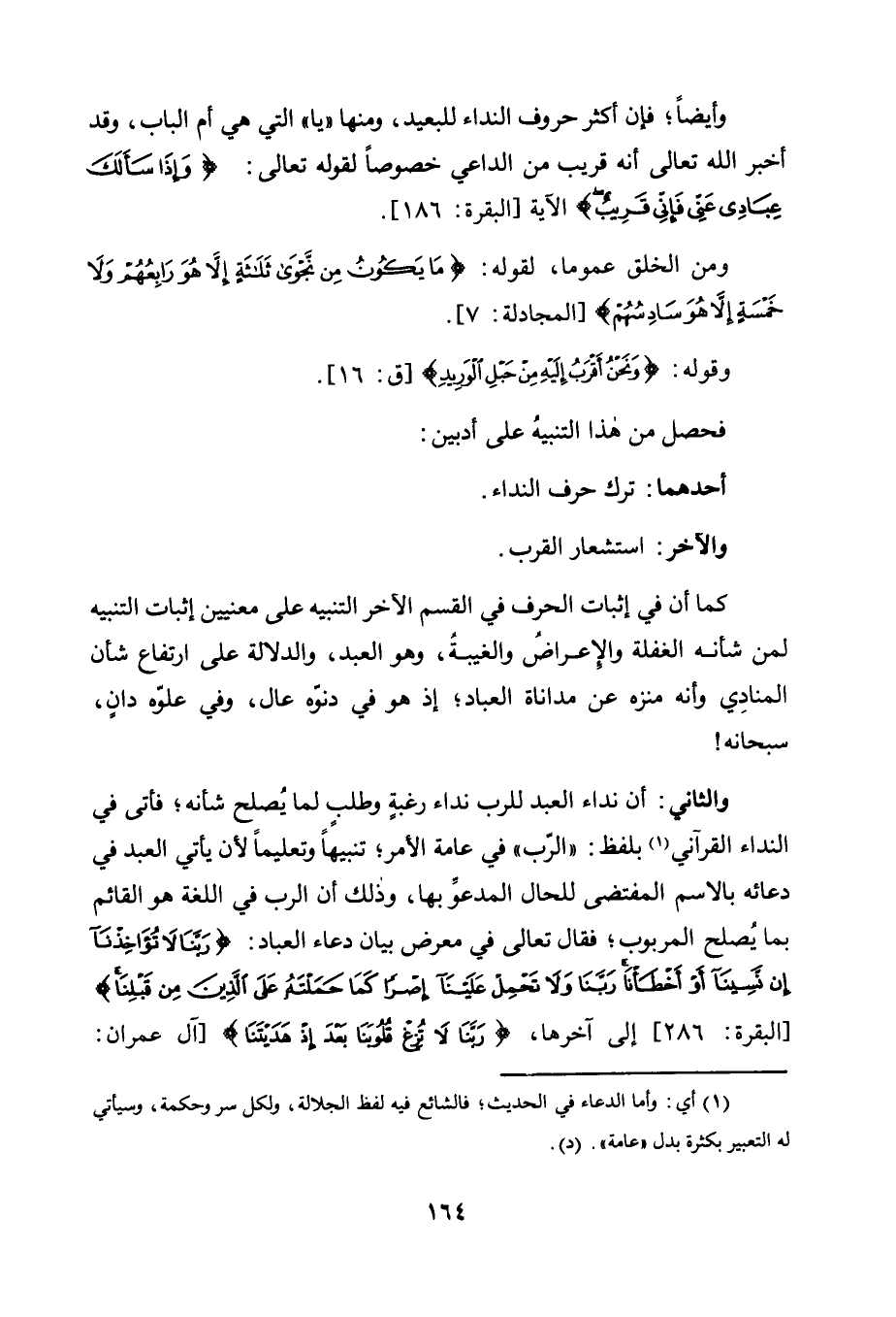 أَنَّ نِدَاءَ الْعَبْدِ لِلرَّبِّ نِدَاءُ رَغْبَةٍ وَطَلَبٍ لِمَا يُصْلِحُ شَأْنَهُ، فَأَتَى فِي النِّدَاءِ الْقُرْآنِيِّ1 بِلَفْظِ: "الرَّبِّ" فِي عَامَّةِ الْأَمْرِ، تَنْبِيهًا وَتَعْلِيمًا لِأَنْ يَأْتِيَ الْعَبْدُ فِي دُعَائِهِ بِالِاسْمِ الْمُقْتَضَى لِلْحَالِ الْمَدْعُوِّ بِهَا، وَذَلِكَ أَنَّ الرَّبَّ فِي اللُّغَةِ هُوَ الْقَائِمُ بِمَا يُصْلِحُ الْمَرْبُوبَ، فَقَالَ تَعَالَى فِي مَعْرِضِ بَيَانِ دُعَاءِ الْعِبَادِ: {رَبَّنَا لَا تُؤَاخِذْنَا إِنْ نَسِينَا أَوْ أَخْطَأْنَا رَبَّنَا وَلا تَحْمِلْ عَلَيْنَا إِصْرًا كَمَا حَمَلْتَهُ عَلَى الَّذِينَ مِنْ قَبْلِنَا} [الْبَقَرَةِ: 286] إِلَى آخِرِهَا، {رَبَّنَا لَا تُزِغْ قُلُوبَنَا بَعْدَ إِذْ هَدَيْتَنَا} [آل عمران: 8] .