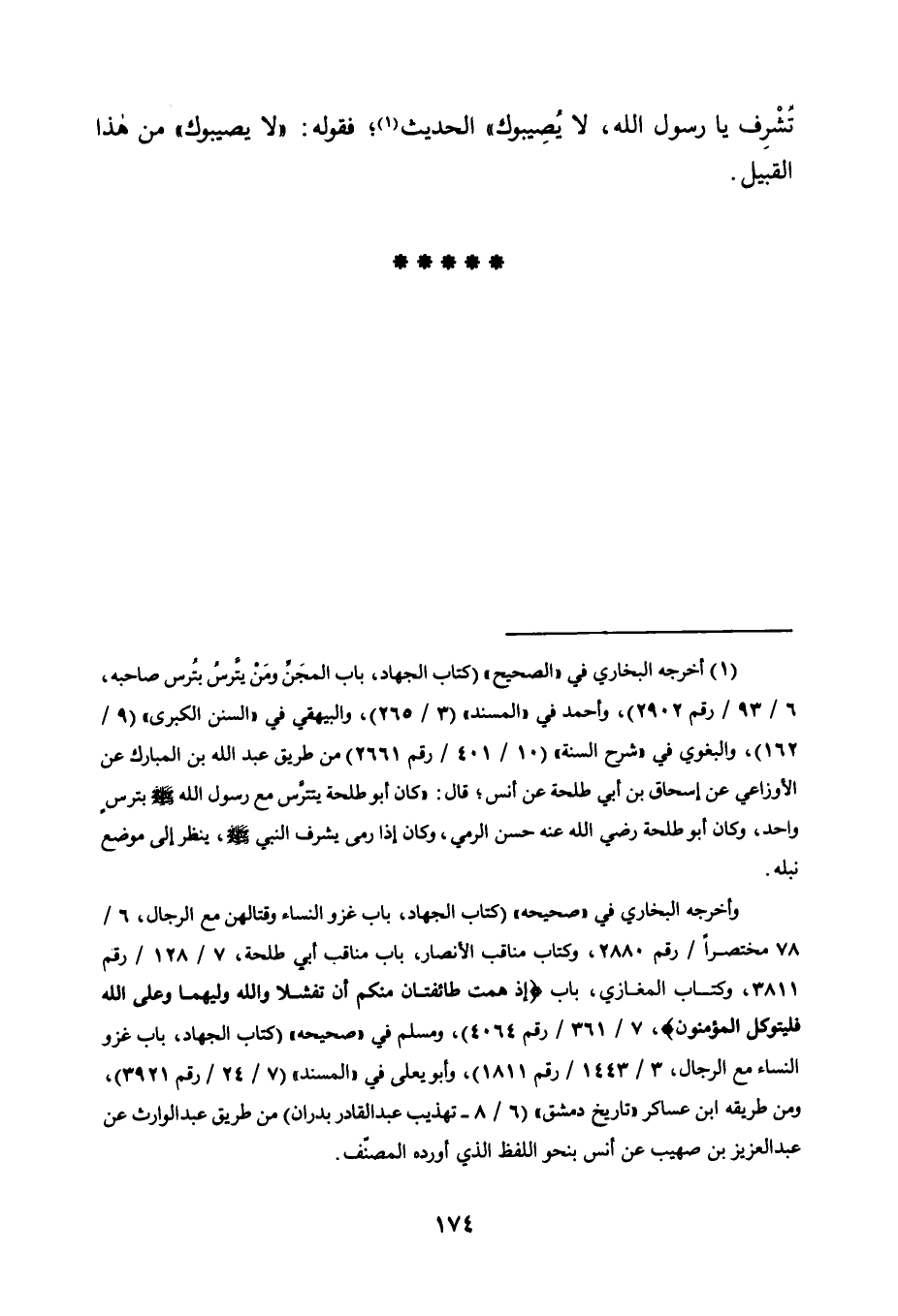 1 أخرجه البخاري في "الصحيح" "كتاب الجهاد، باب المجن ومن يترس بترس صاحبه، 6/ 93/ رقم 2902"، وأحمد في "المسند" "3/ 265"، والبيهقي في "السنن الكبرى" "9/ 162"، والبغوي في "شرح السنة" "10/ 401/ رقم 2661" من طريق عبد الله بن المبارك عن الأوزاعي عن إسحاق بن أبي طلحة عن أنس، قال: "كان أبو طلحة يتترس مع رسول الله صلى الله عليه وسلم بترس واحد، وكان أبو طلحة رضي الله عنه حسن الرمي، وكان إذا رمي يشرف النبي صلى الله عليه وسلم، ينظر إلى موضع نبله.