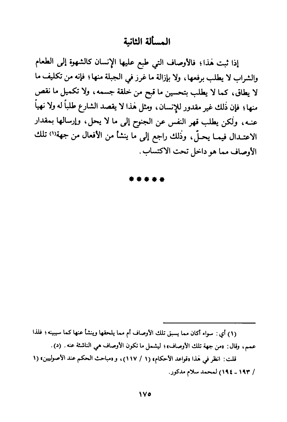 إِذَا ثَبَتَ هَذَا، فَالْأَوْصَافُ الَّتِي طُبِعَ عَلَيْهَا الْإِنْسَانُ كَالشَّهْوَةِ إِلَى الطَّعَامِ وَالشَّرَابِ لَا يُطْلَبُ بِرَفْعِهَا، وَلَا بِإِزَالَةِ مَا غُرِزَ فِي الْجِبِلَّةِ مِنْهَا، فَإِنَّهُ مِنْ تَكْلِيفِ مَا لَا يُطَاقُ، كَمَا لَا يُطْلَبُ بِتَحْسِينِ مَا قَبُحَ مِنْ خِلْقَةِ جِسْمِهِ، وَلَا تَكْمِيلِ مَا نَقَصَ مِنْهَا فَإِنَّ ذَلِكَ غَيْرُ مَقْدُورٍ لِلْإِنْسَانِ، وَمِثْلُ هَذَا لَا يَقْصِدُ الشَّارِعُ طَلَبًا لَهُ وَلَا نَهْيًا عَنْهُ، وَلَكِنْ يَطْلُبُ قَهْرَ النَّفْسِ عن الجنوح إلا مَا لَا يَحِلُّ، وَإِرْسَالَهَا بِمِقْدَارِ الِاعْتِدَالِ فِيمَا يَحِلُّ، وَذَلِكَ رَاجِعٌ إِلَى مَا يَنْشَأُ مِنَ الْأَفْعَالِ مِنْ جِهَةِ1 تِلْكَ الْأَوْصَافِ مِمَّا هُوَ داخل تحت الاكتساب