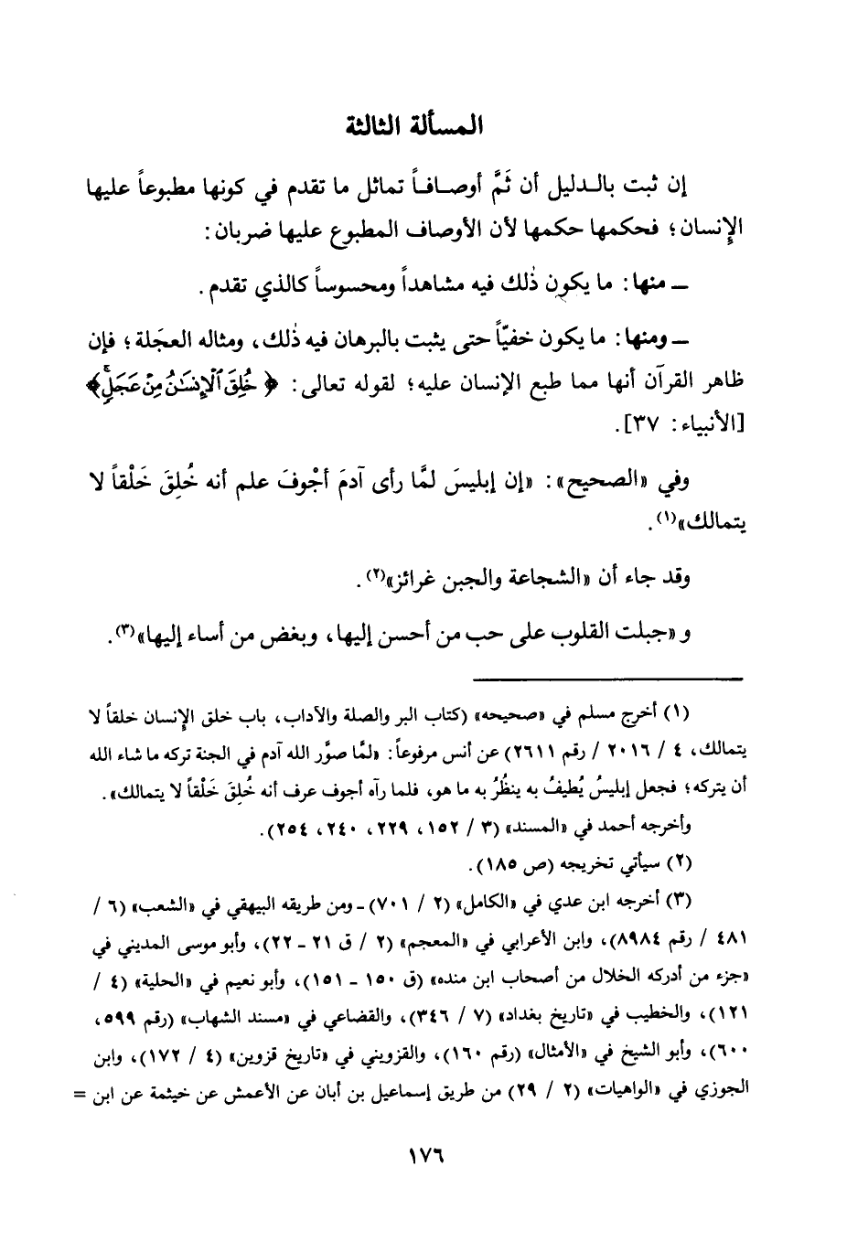 - وَمِنْهَا: مَا يَكُونُ خَفِيًّا حَتَّى يَثْبُتَ بِالْبُرْهَانِ فِيهِ ذَلِكَ، وَمِثَالُهُ الْعَجَلَةُ، فَإِنَّ ظَاهِرَ الْقُرْآنِ أَنَّهَا مِمَّا طُبِعَ الْإِنْسَانُ عَلَيْهِ، لِقَوْلِهِ تَعَالَى: {خُلِقَ الْأِنْسَانُ مِنْ عَجَلٍ} [الْأَنْبِيَاءِ: 37] .