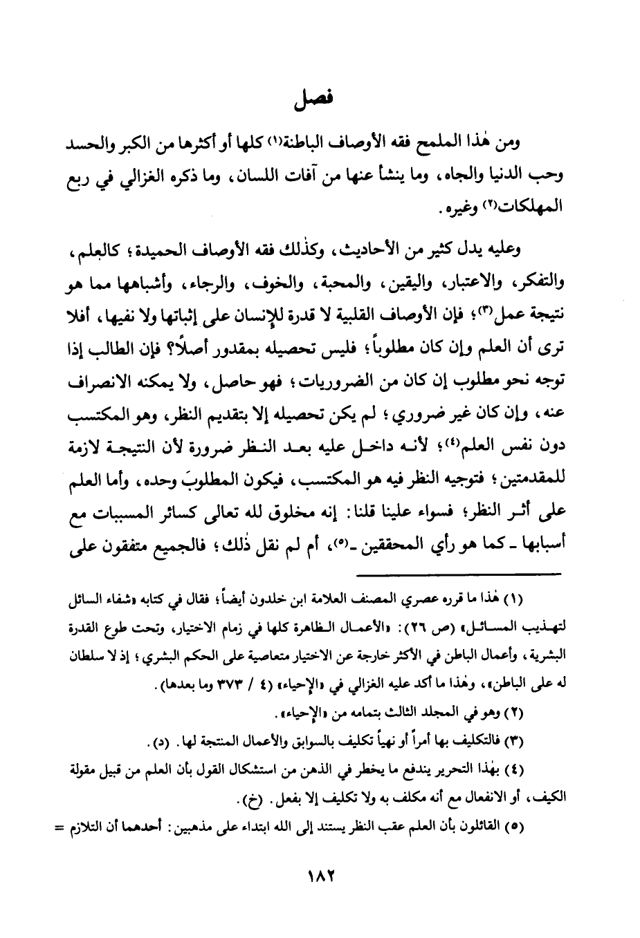 1 هذا ما قرره عصري المصنف العلامة ابن خلدون أيضا، فقال في كتابه "شفاء السائل لتهذيب المسائل" "ص26": "الأعمال الظاهرة كلها في زمام الاختيار، وتحت طوع القدرة البشرية، وأعمال الباطن في الأكثر خارجة عن الاختيار متعاصية على الحكم البشري، إذ لا سلطان له على الباطن"، وهذا ما أكد عليه الغزالي في "الإحياء" "4/ 373 وما بعدها".