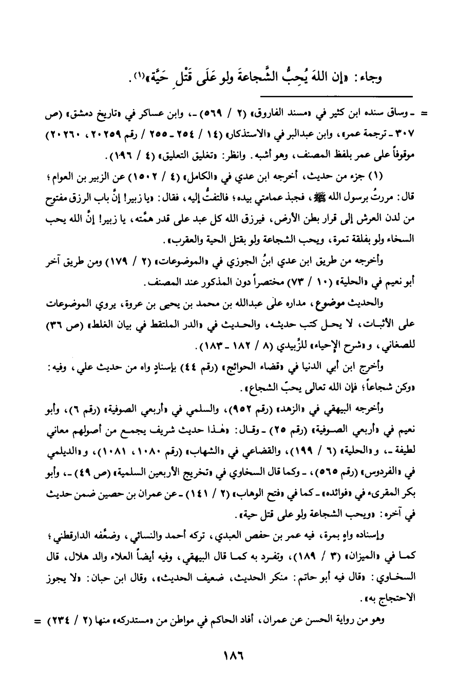 وأخرجه البيهقي في "الزهد" "رقم 952"، والسلمي في "أربعي الصوفية" "رقم 6"، وأبو نعيم في "أربعي الصوفية" "رقم 25"، وقال: "هذا حديث شريف يجمع من أصولهم معاني لطيفة"، والحلية" "6/ 199"، والقضاعي في "الشهاب" "رقم 1080، 1081"، و"الديلمي في "الفردوس" "رقم 565"، وكما قال السخاوي في "تخريج الأربعين السلمية" "ص49"، وأبو بكر المقرئ في "فوائده" -كما في "فتح الوهاب" "2/ 141"- عن عمران بن حصين ضمن حديث في آخره: "ويحب الشجاعة ولو على قتل حية".