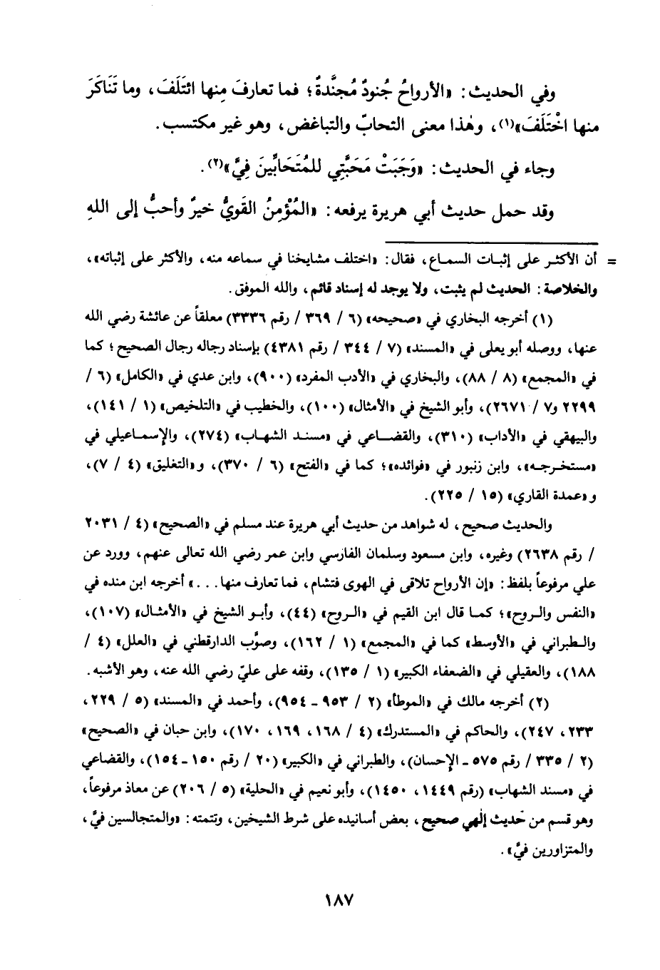 وَفِي الْحَدِيثِ: "الْأَرْوَاحُ جُنُودٌ مُجَنَّدَةٌ، فَمَا تَعَارَفَ مِنْهَا ائْتَلَفَ، وَمَا تَنَاكَرَ مِنْهَا اخْتَلَفَ" 1 وَهَذَا مَعْنَى التَّحَابِّ وَالتَّبَاغُضِ، وَهُوَ غَيْرُ مُكْتَسَبٍ.