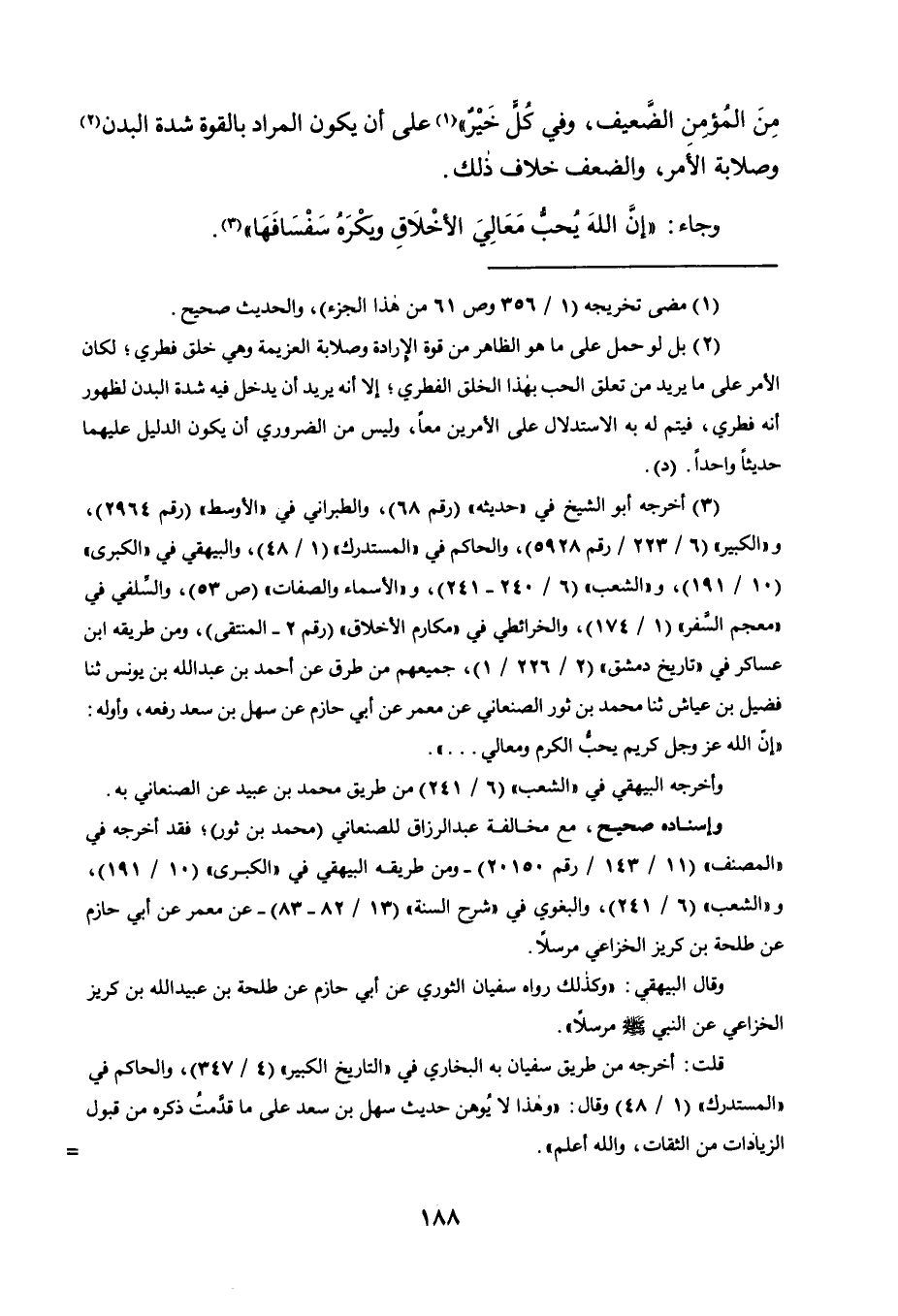 2 بل لو حمل على ما هو الظاهر من قوة الإرادة وصلابة العزيمة وهي خلق فطري، لكان الأمر على ما يريد من تعلق الحب بهذا الخلق الفطري، إلا أنه يريد أن يدخل فيه شدة البدن لظهور أنه فطري، فيتم له به الاستدلال على الأمرين معا، وليس من الضروري أن يكون الدليل عليهما حديثا واحدا. "د".