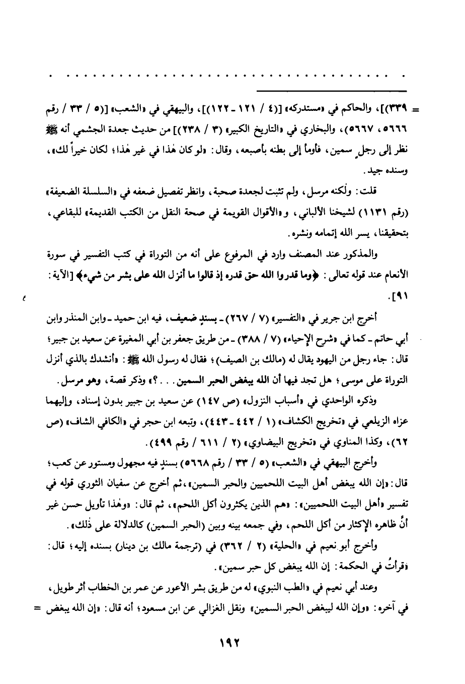 وأخرج البيهقي في "الشعب" "5/ 33/ رقم 5668" بسند فيه مجهول ومستور عن كعب، قال: إن الله يبغض أهل البيت اللحميين والحبر السمين"، ثم أخرج عن سفيان الصوري قوله في تفسير "أهل البيت اللحميين": "هم الذين يكثرون أكل اللحم"، ثم قال: "وهذا تأويل حسن غير أن ظاهره الإكثار من أكل اللحم، وفي جمعه بينه وبين "الحبر السمين" كالدلالة على ذلك".