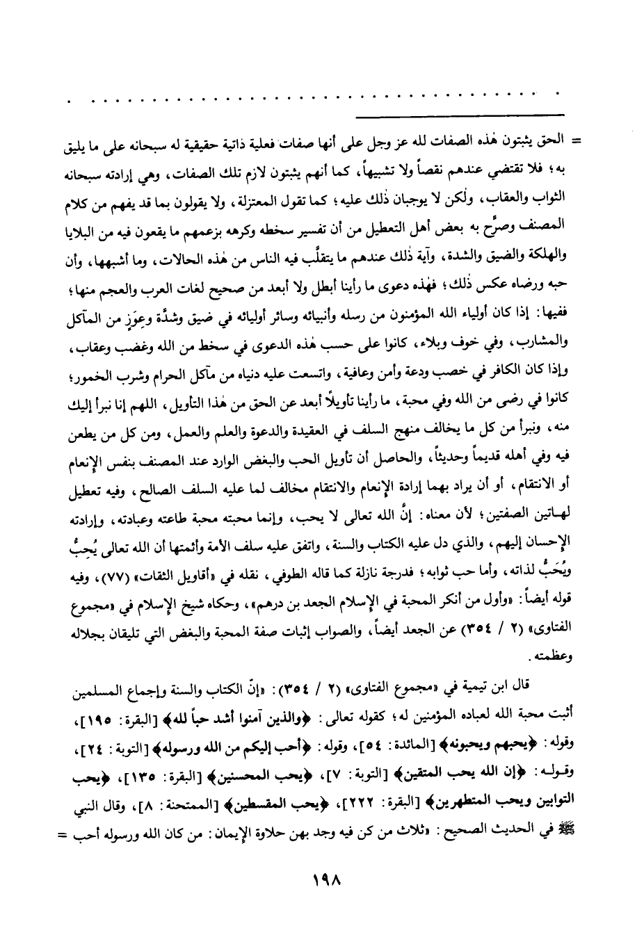 = الحق يثبتون هذه الصفات لله عز وجل على أنها صفات فعلية ذاتية حقيقية له سبحانه على ما يليق به، فلا تقتضي عندهم نقصا ولا تشبيها، كما أنهم يثبتون لازم تلك الصفات، وهي إرادته سبحانه الثواب والعقاب، ولكن لا يوجبان ذلك عليه، كما تقول المعتزلة، ولا يقولون بما قد يفهم من كلام المصنف وصرح به بعض أهل التعطيل من أن تفسير سخطه وكرهه بزعمهم ما يقعون فيه من البلايا والهلكة والضيق والشدة، وآية ذلك عندهم ما يتقلب فيه من هذه الحالات، وما أشبهها، وأن حبه ورضاه عكس ذلك، فهذه دعوى ما رأينا أبطل ولا أبعد من صحيح لغات العرب والعجم منها، ففيها: إذا كان أولياء الله المؤمنون من رسله وأنبيائه وسائر أوليائه في ضيق وشدة وعوز من المآكل والمشارب، وفي خوف وبلاء، كانوا على حسب هذه الدعوى في سخط من الله وغضب وعقاب، وإذا كان الكافر في خصب ودعة وأمن وعافية، واتسعت عليه دنياه من مآكل الحرام وشرب الخمور، كانوا في رضي من الله وفي محبة، ما رأينا تأويلا أبعد عن الحق من هذا التأويل، اللهم إنا نبرأ إليك منه، ونبرأ من كل ما يخالف منهج السلف في العقيدة والدعوة والعلم والعمل، ومن كل من يطعن فيه وفي أهله قديما وحديثا، والحاصل أن تأويل الحب والبغض الوارد عند المصنف بنفس الإنعام أو الانتقام، أو أن يراد بهما إرادة الإنعام والانتقام مخالف لما عليه السلف الصالح، وفيه تعطيل لهاتين الصفتين، لأن معناه: إن الله تعالى لا يحب، وإنما محبته محبة طاعته وعبادته، وإرادته الإحسان إليهم، والذي دل عليه الكتاب والسنة، واتفق عليه سلف الأمة وأئمتها أن الله تعالى يحب ويُحَبُّ لذاته، وأما حب ثوابه، فدرجة نازلة كما قاله الطوفي، نقله، في "أقاويل الثقات" "77"، وفيه قوله أيضا: "وأول من أنكر المحبة في الإسلام الجعد بن درهم" وحكاه شيخ الإسلام في "مجموع الفتاوى" "2/ 354" عن الجعد أيضا، والصواب إثبات صفة المحبة والبغض اللتين تليقان بجلاله. وعظمته.