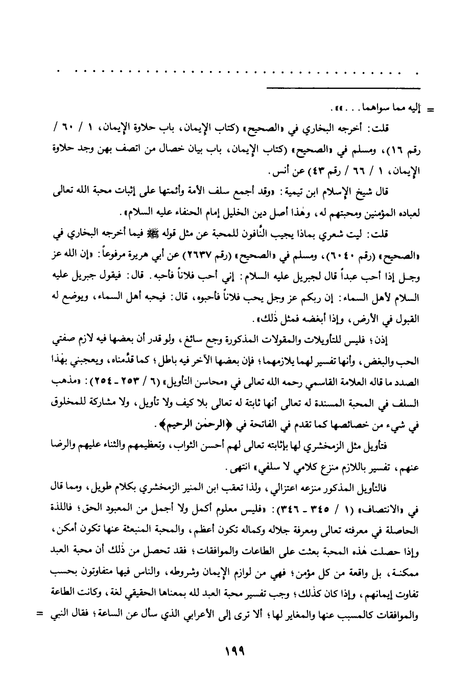 فهذا الحديث ناطق بأن المفهوم من المحبة لله غير الأعمال والتزام الطاعات، لأن الأعرابي نفاها وأثبت الحب، وأقره عليه الصلاة والسلام على ذلك. وانظر منه "4/ 9"، وهو بذيل"الكشاف" ط- دار المعرفة.
