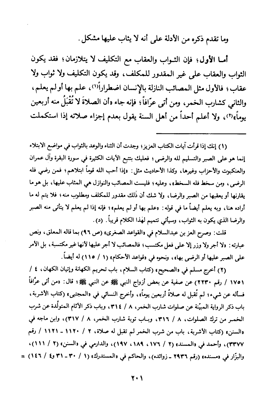 أَمَّا الْأَوَّلُ، فَإِنَّ الثَّوَابَ وَالْعِقَابَ مَعَ التَّكْلِيفِ لَا يَتَلَازَمَانِ، فَقَدْ يَكُونُ الثَّوَابُ وَالْعِقَابُ عَلَى غَيْرِ الْمَقْدُورِ لِلْمُكَلَّفِ، وَقَدْ يَكُونُ التَّكْلِيفُ وَلَا ثَوَابَ وَلَا عِقَابَ، فَالْأَوَّلُ مِثْلُ الْمَصَائِبِ النَّازِلَةِ بِالْإِنْسَانِ اضْطِرَارًا1، عَلِمَ بِهَا أَوْ لَمْ يَعْلَمْ، وَالثَّانِي كَشَارِبِ الْخَمْرِ، وَمَنْ أَتَى عَرَّافًا، فَإِنَّهُ جَاءَ "أَنَّ الصَّلَاةَ لَا تُقْبَلُ مِنْهُ أَرْبَعِينَ يَوْمًا" 2، وَلَا أَعْلَمَ أَحَدًا مِنْ أَهْلِ السُّنَّةِ يَقُولُ بِعَدَمِ إِجْزَاءِ صلاته إذا استكملت