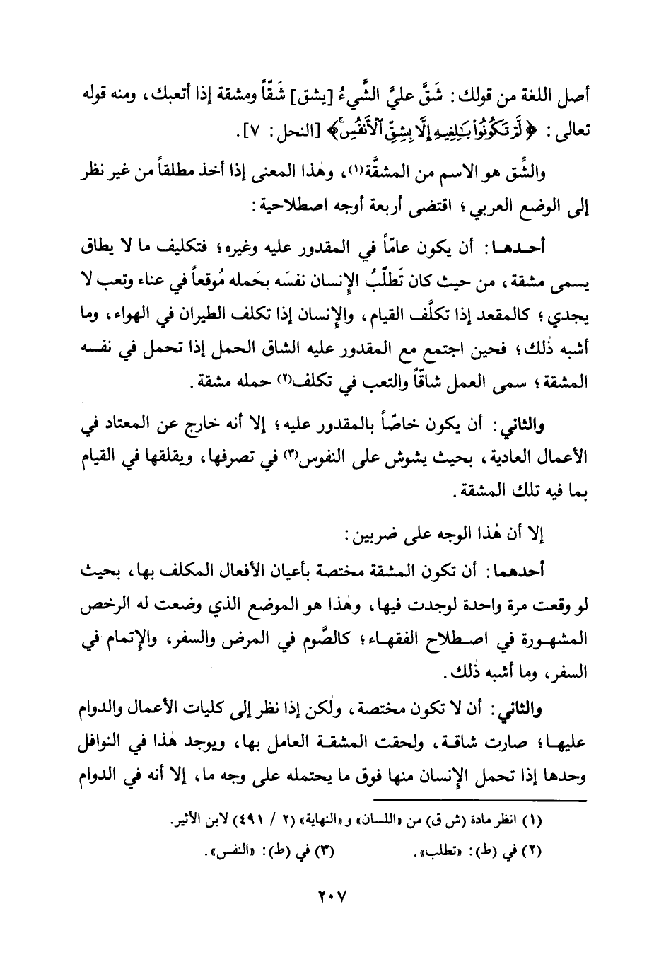 أَنْ يَكُونَ خَاصًّا بِالْمَقْدُورِ عَلَيْهِ، إِلَّا أَنَّهُ خَارِجٌ عَنِ الْمُعْتَادِ فِي الْأَعْمَالِ الْعَادِيَّةِ، بِحَيْثُ يُشَوِّشُ عَلَى النُّفُوسِ3 فِي تَصَرُّفِهَا، وَيُقْلِقُهَا فِي الْقِيَامِ بِمَا فِيهِ تِلْكَ الْمَشَقَّةُ.