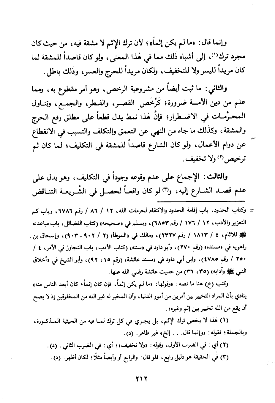 وَإِنَّمَا قَالَ: "مَا لَمْ يَكُنْ إِثْمًا"؛ لِأَنَّ تَرْكَ الْإِثْمِ لَا مَشَقَّةَ فِيهِ، مِنْ حَيْثُ كَانَ مُجَرَّدَ تَرْكٍ1، إِلَى أَشْبَاهِ ذَلِكَ مِمَّا فِي هَذَا الْمَعْنَى، وَلَوْ كَانَ قَاصِدًا لِلْمَشَقَّةِ لَمَا كَانَ مُرِيدًا لِلْيُسْرِ وَلَا لِلتَّخْفِيفِ، وَلَكَانَ مُرِيدًا لِلْحَرَجِ وَالْعُسْرِ، وَذَلِكَ بَاطِلٌ.