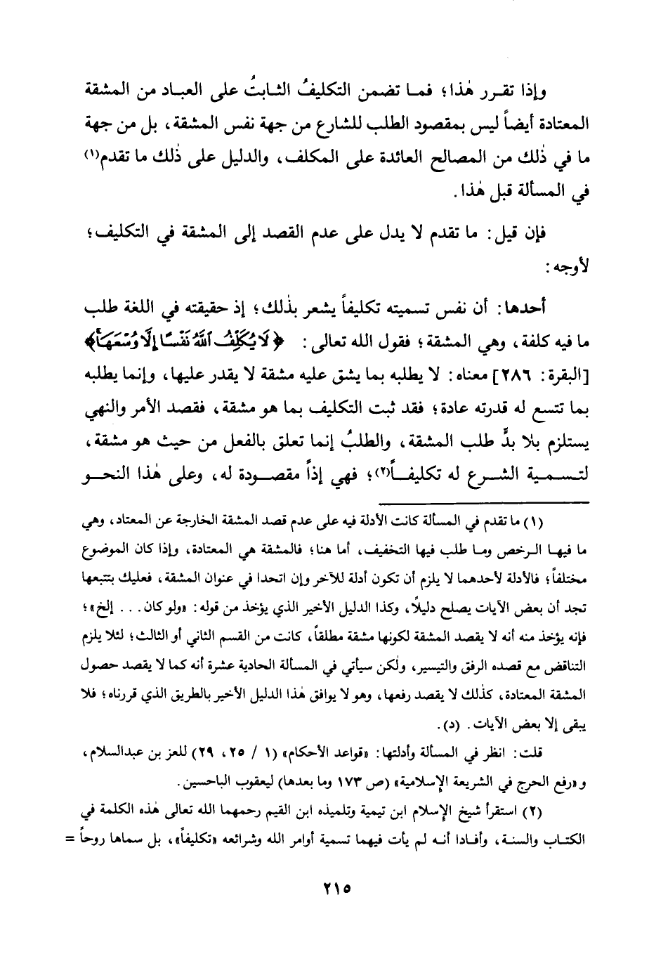 أَنَّ نَفْسَ تَسْمِيَتِهِ تَكْلِيفًا يُشْعِرُ بِذَلِكَ، إِذْ حَقِيقَتُهُ فِي اللُّغَةِ طَلَبُ مَا فِيهِ كُلْفَةٌ، وَهِيَ الْمَشَقَّةُ، فَقَوْلُ اللَّهِ تَعَالَى: {لَا يُكَلِّفُ اللَّهُ نَفْسًا إِلَّا وُسْعَهَا} [الْبَقَرَةِ: 286] مَعْنَاهُ: لَا يَطْلُبُهُ بِمَا يَشُقُّ عَلَيْهِ مَشَقَّةً لَا يَقْدِرُ عَلَيْهَا، وَإِنَّمَا يَطْلُبُهُ بِمَا تَتَّسِعُ لَهُ قُدْرَتُهُ عَادَةً، فَقَدْ ثَبَتَ التَّكْلِيفُ بِمَا هُوَ مَشَقَّةٌ، فَقَصْدُ الْأَمْرِ وَالنَّهْيِ يَسْتَلْزِمُ بِلَا بُدٍّ طَلَبَ الْمَشَقَّةِ، وَالطَّلَبُ إِنَّمَا تَعَلَّقَ بِالْفِعْلِ مِنْ حَيْثُ هُوَ مَشَقَّةٌ، لِتَسْمِيَةِ الشَّرْعِ لَهُ تَكْلِيفًا2، فَهِيَ إذن مقصودة له، وعلى هذا النحو