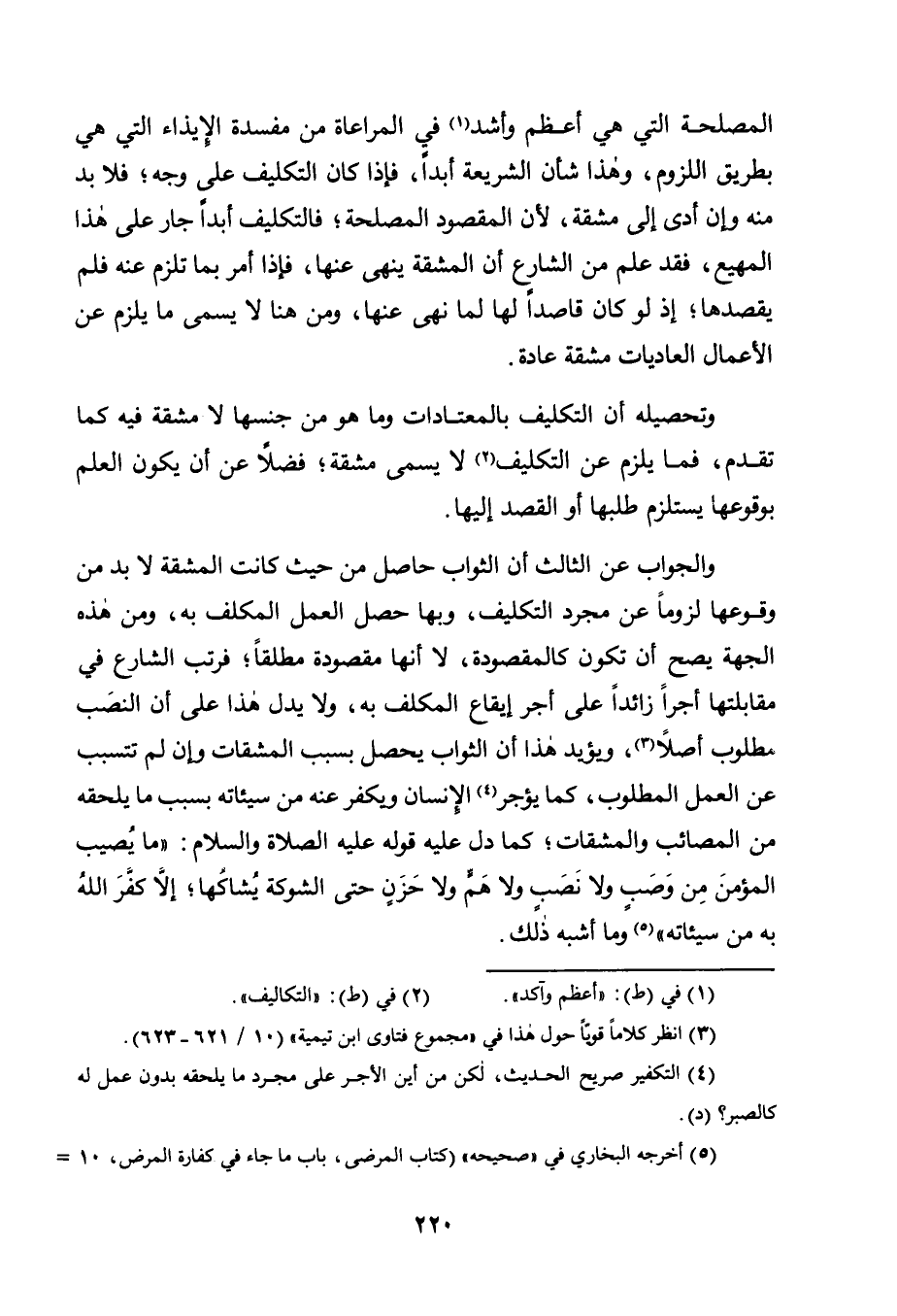 وَالْجَوَابُ عَنِ الثَّالِثِ أَنَّ الثَّوَابَ حَاصِلٌ مِنْ حَيْثُ كَانَتِ الْمَشَقَّةُ لَا بُدَّ مِنْ وُقُوعِهَا لُزُومًا عَنْ مُجَرَّدِ التَّكْلِيفِ، وَبِهَا حَصَلَ الْعَمَلُ الْمُكَلَّفُ بِهِ، وَمِنْ هَذِهِ الْجِهَةِ يَصِحُّ أَنْ تَكُونَ كالمقصودة، لَا أَنَّهَا مَقْصُودَةٌ مُطْلَقًا، فَرَتَّبَ الشَّارِعُ فِي مُقَابَلَتِهَا أَجْرًا زَائِدًا عَلَى أَجْرِ إِيقَاعِ الْمُكَلَّفِ بِهِ، وَلَا يَدُلُّ هَذَا عَلَى أَنَّ النَّصَب مَطْلُوبٌ أَصْلًا3، وَيُؤَيِّدُ هَذَا أَنَّ الثَّوَابَ يَحْصُلُ بِسَبَبِ الْمَشَقَّاتِ وَإِنْ لَمْ تَتَسَبَّبْ عَنِ الْعَمَلِ الْمَطْلُوبِ، كَمَا يُؤَجَرُ4 الْإِنْسَانُ وَيُكَفَّرُ عَنْهُ مِنْ سَيِّئَاتِهِ بِسَبَبِ مَا يَلْحَقُهُ مِنَ الْمَصَائِبِ وَالْمَشَقَّاتِ، كَمَا دَلَّ عَلَيْهِ قَوْلُهُ عَلَيْهِ الصَّلَاةُ وَالسَّلَامُ: "مَا يُصِيبُ الْمُؤْمِنَ مِنْ وَصَب وَلَا نَصَب وَلَا هَمٍّ وَلَا حَزَن حَتَّى الشَّوْكَةٍ يُشَاكُهَا، إِلَّا كَفَّرَ اللَّهُ بِهِ مِنْ سَيِّئَاتِهِ" 5 وَمَا أشبه ذلك.