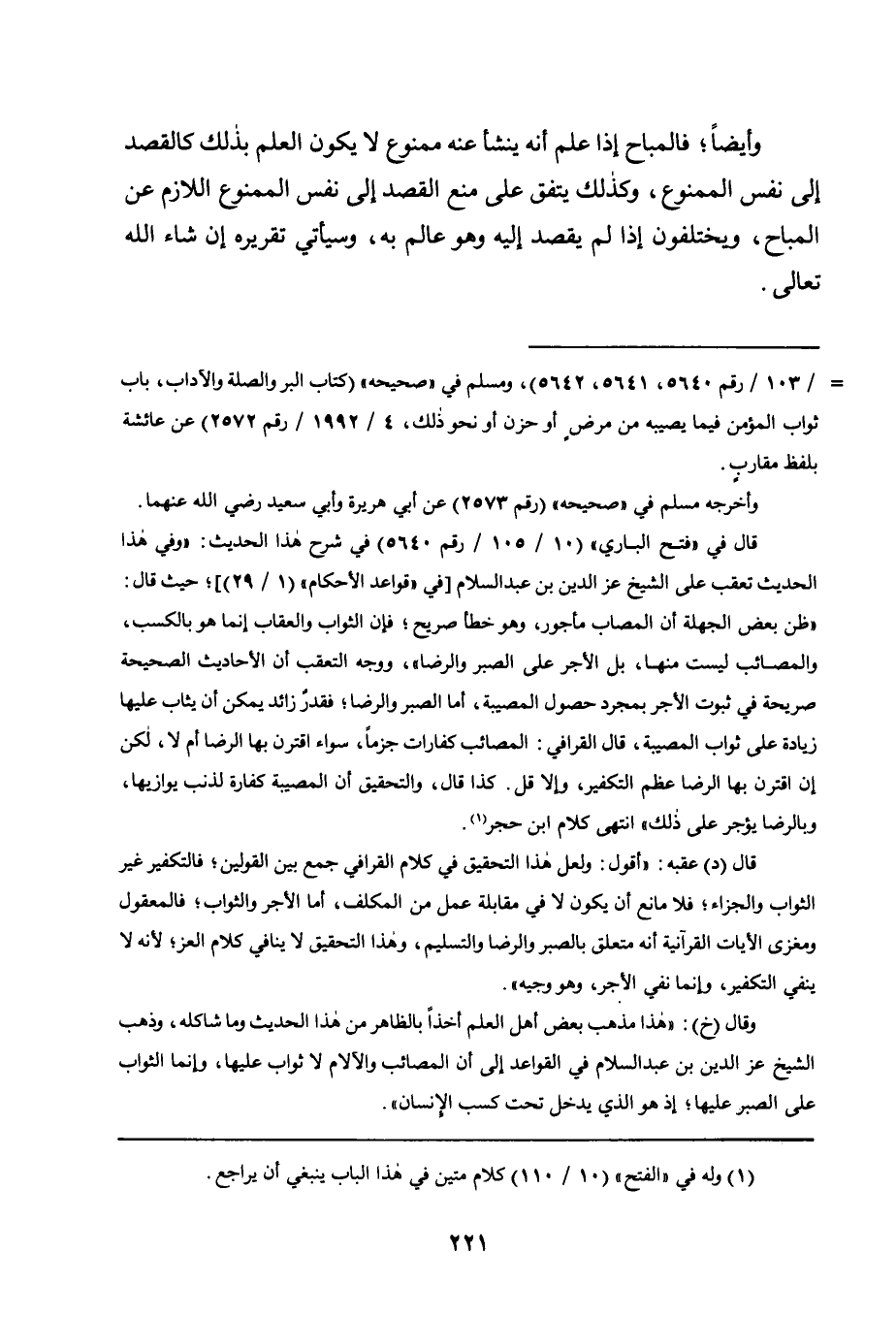 قال "د" عقبه: "أقول: ولعل هذا التحقيق في كلام القرافي جمع بين القولين فالتكفير غير الثواب والجزاء، فلا مانع أن يكون "لا" في مقابلة عمل من المكلَّف، أما الأجر والثواب، فالمعقول ومغزى الآيات القرآنية أنه متعلق بالصبر والرضا والتسليم، وهذا التحقيق لا ينافي كلام العز؛ لأنه لا ينفي التكفير، وإنما نفى الأجر، وهو وجيه".