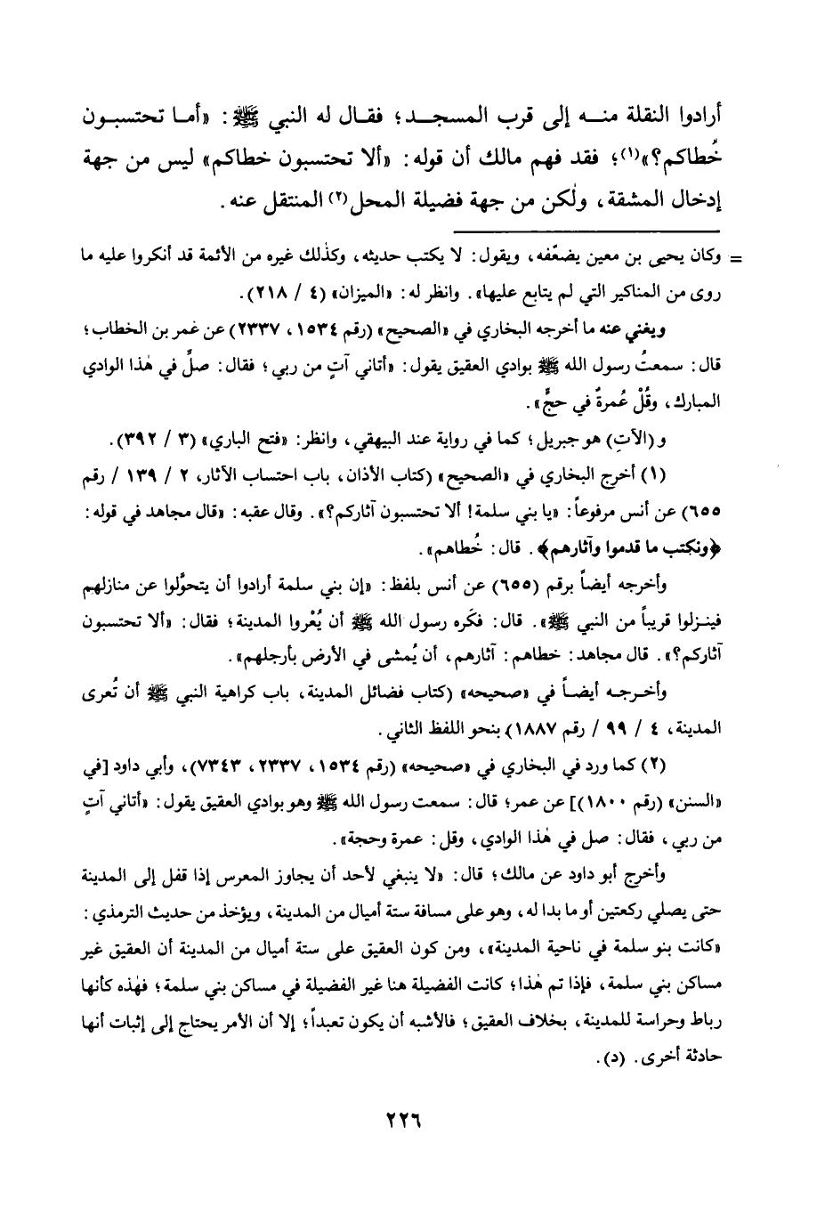 وأخرج أبو داود عن مالك، قال: "لا ينبغي لأحد أن يجاوز المعرس إذا قفل إلى المدينة حتى يصلي ركعتين أو ما بدا له، وهو على مسافة ستة أميال من المدينة، ويؤخذ من حديث الترمذي: "كانت بنو سلمة في ناحية المدينة"، ومن كون العقيق على ستة أميال من المدينة أن العقيق غير مساكن بني سلمة، فإذا تم هذا، كانت الفضيلة هنا غير الفضيلة في مساكن بني سلمة، فهذه كأنها رباط وحراسة للمدينة، بخلاف العقيق، فالأشبه أن يكون تعبُّدًا، إلا أن الأمر يحتاج إلى إثبات أنها حادثة أخرى. "د".