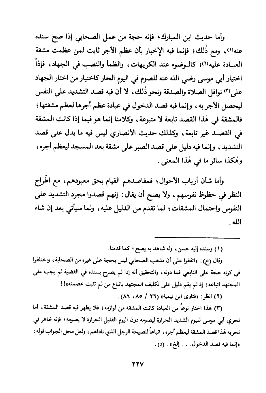 وَأَمَّا حَدِيثُ ابْنِ الْمُبَارَكِ فَإِنَّهُ حُجَّةٌ مِنْ عَمَلِ الصَّحَابِيِّ إِذَا صَحَّ سَنَدُهُ عَنْهُ1، وَمَعَ ذَلِكَ فَإِنَّمَا فِيهِ الْإِخْبَارُ بِأَنَّ عِظَمَ الْأَجْرِ ثَابِتٌ لِمَنْ عَظُمَتْ مَشَقَّةُ الْعِبَادَةِ عَلَيْهِ2، كَالْوُضُوءِ عند الكريهات، والظمأ والنصب في الجهاد، فإذن اخْتِيَارُ أَبِي مُوسَى رِضِيَ اللَّهُ عَنْهُ لِلصَّوْمِ فِي الْيَوْمِ الْحَارِّ كَاخْتِيَارِ مَنِ اخْتَارَ الْجِهَادَ عَلَى3 نَوَافِلِ الصَّلَاةِ وَالصَّدَقَةِ وَنَحْوِ ذَلِكَ، لَا أَنَّ فِيهِ قَصْدَ التَّشْدِيدِ عَلَى النَّفْسِ؛ لِيَحْصُلَ الْأَجْرُ بِهِ، وَإِنَّمَا فِيهِ قَصْدُ الدُّخُولِ فِي عِبَادَةٍ عَظُمَ أَجْرُهَا؛ لِعِظَمِ مَشَقَّتِهَا، فَالْمَشَقَّةُ فِي هَذَا الْقَصْدِ تَابِعَةٌ لَا مَتْبُوعَةٌ، وَكَلَامُنَا إِنَّمَا هُوَ فِيمَا إِذَا كَانَتِ الْمَشَقَّةُ فِي الْقَصْدِ غَيْرَ تَابِعَةٍ، وَكَذَلِكَ حَدِيثُ الْأَنْصَارِيِّ لَيْسَ فِيهِ مَا يَدُلُّ عَلَى قَصْدِ التَّشْدِيدِ، وَإِنَّمَا فِيهِ دَلِيلٌ عَلَى قَصْدِ الصَّبْرِ عَلَى مَشَقَّةِ بُعْدِ الْمَسْجِدِ لِيَعْظُمَ أَجْرُهُ، وَهَكَذَا سَائِرُ مَا فِي هَذَا الْمَعْنَى.