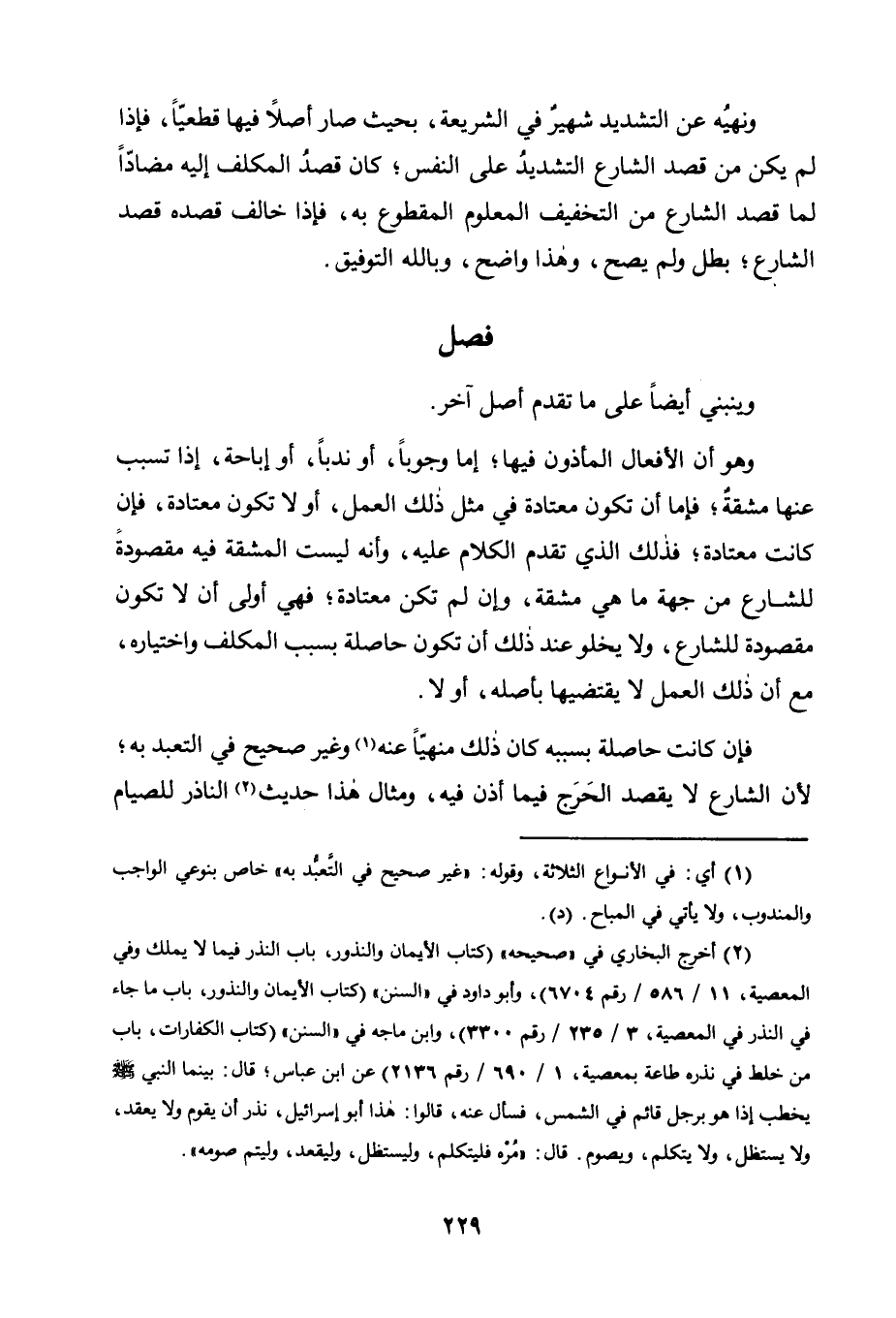 وَنَهْيُهُ عَنِ التَّشْدِيدِ شَهِيرٌ فِي الشَّرِيعَةِ، بِحَيْثُ صَارَ أَصْلًا فِيهَا قَطْعِيًّا، فَإِذَا لَمْ يَكُنْ مِنْ قَصْدِ الشَّارِعِ التَّشْدِيدُ عَلَى النَّفْسِ، كَانَ قَصْدُ الْمُكَلَّفِ إِلَيْهِ مُضَادًّا لِمَا قَصَدَ الشَّارِعُ مِنَ التَّخْفِيفِ الْمَعْلُومِ الْمَقْطُوعِ بِهِ، فَإِذَا خَالَفَ قَصْدُهُ قَصْدَ الشَّارِعِ، بَطَلَ وَلَمْ يَصِحَّ، وَهَذَا وَاضِحٌ، وَبِاللَّهِ التَّوْفِيقُ.