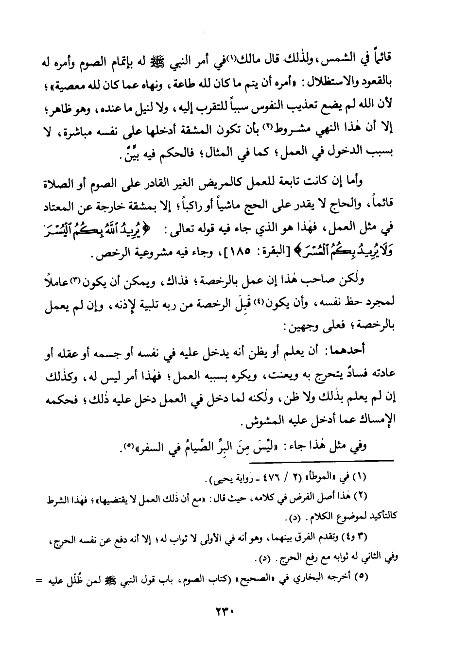 قَائِمًا فِي الشَّمْسِ، وَلِذَلِكَ قَالَ مَالِكٌ1 فِي أَمْرِ النَّبِيِّ صَلَّى اللَّهُ عَلَيْهِ وَسَلَّمَ لَهُ بِإِتْمَامِ الصَّوْمِ وَأَمْرِهِ لَهُ بِالْقُعُودِ وَالِاسْتِظْلَالِ: "أَمَرَهُ أَنْ يُتِمَّ مَا كَانَ لِلَّهِ طَاعَةً، وَنَهَاهُ عَمَّا كَانَ لِلَّهِ مَعْصِيَةً"؛ لِأَنَّ اللَّهَ لَمْ يَضَعْ تَعْذِيبَ النُّفُوسِ سَبَبًا لِلتَّقَرُّبِ إِلَيْهِ، وَلَا لِنَيْلِ مَا عِنْدَهُ، وَهُوَ ظَاهِرٌ، إِلَّا أَنَّ هَذَا النَّهْيَ مَشْرُوطٌ2 بِأَنْ تَكُونَ الْمَشَقَّةُ أَدْخَلَهَا عَلَى نَفْسِهِ مُبَاشَرَةً، لَا بِسَبَبِ الدُّخُولِ فِي الْعَمَلِ، كَمَا فِي الْمِثَالِ، فَالْحُكْمُ فِيهِ بيِّن.
