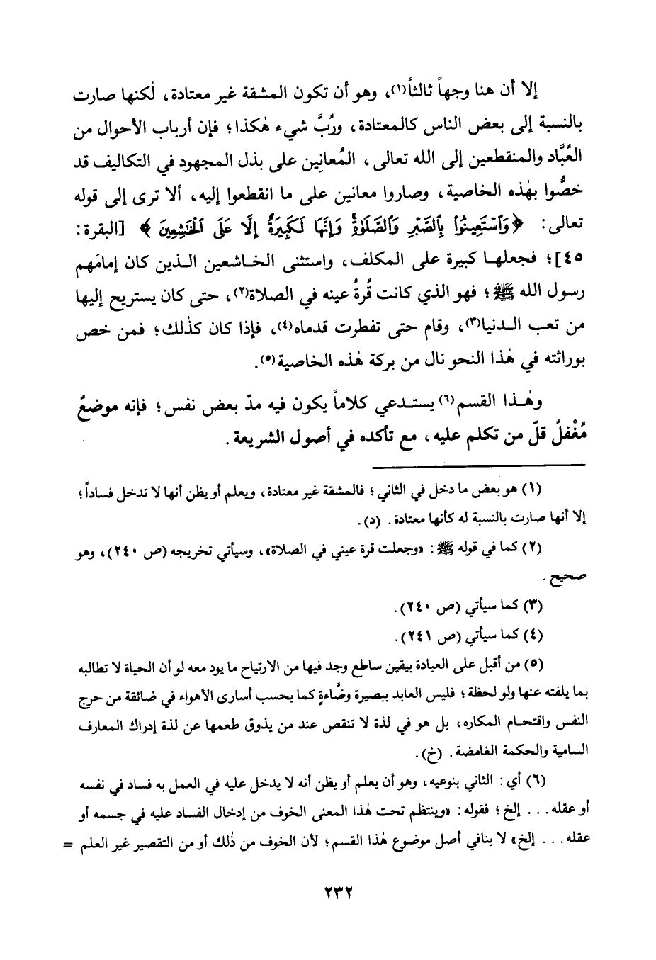إِلَّا أَنَّ هُنَا وَجْهًا ثَالِثًا1، وَهُوَ أَنْ تَكُونَ الْمَشَقَّةُ غَيْرَ مُعْتَادَةٍ، لَكِنَّهَا صَارَتْ بِالنِّسْبَةِ إِلَى بَعْضِ النَّاسِ كَالْمُعْتَادَةِ، وَرُبَّ شَيْءٍ هَكَذَا، فَإِنَّ أَرْبَابَ الْأَحْوَالِ مِنَ العُبّاد وَالْمُنْقَطِعِينَ إِلَى اللَّهِ تَعَالَى، الْمُعَانِينَ عَلَى بَذْلِ الْمَجْهُودِ فِي التَّكَالِيفِ قَدْ خُصوا بِهَذِهِ الْخَاصِّيَّةِ، وَصَارُوا مُعانين عَلَى مَا انْقَطَعُوا إِلَيْهِ، أَلَا تَرَى إِلَى قوله تعالى: {وَاسْتَعِينُوا بِالصَّبْرِ وَالصَّلاةِ وَإِنَّهَا لَكَبِيرَةٌ إِلَّا عَلَى الْخَاشِعِينَ} [الْبَقَرَةِ: 45] ، فَجَعَلَهَا كَبِيرَةً عَلَى الْمُكَلَّفِ، وَاسْتَثْنَى الْخَاشِعِينَ الَّذِينَ كَانَ إِمَامَهُمْ رَسُولُ اللَّهِ صَلَّى اللَّهُ عَلَيْهِ وَسَلَّمَ فَهُوَ الَّذِي كَانَتْ قُرَّةُ عَيْنِهِ فِي الصَّلَاةِ2، حَتَّى كَانَ يَسْتَرِيحُ إِلَيْهَا مِنْ تَعَبِ الدُّنْيَا3، وَقَامَ حَتَّى تَفَطَّرَتْ قَدَمَاهُ4، فَإِذَا كَانَ كَذَلِكَ، فَمَنْ خُصّ بِوِرَاثَتِهِ فِي هَذَا النَّحْوِ نَالَ مِنْ بَرَكَةِ هَذِهِ الْخَاصِّيَّةِ5.