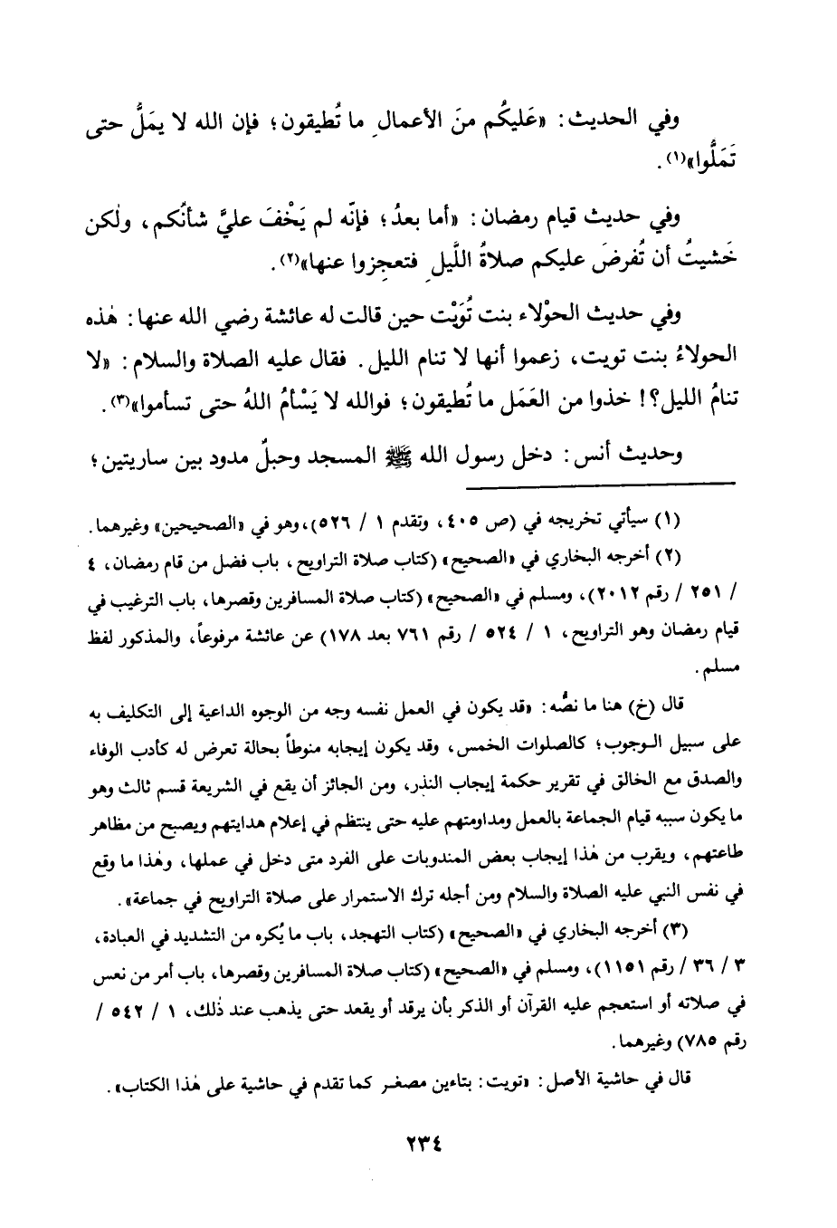 وَفِي حَدِيثِ الْحَوْلَاءِ بِنْتِ تُوَيْتٍ حِينَ قَالَتْ لَهُ عَائِشَةُ رَضِيَ اللَّهُ عَنْهَا: هَذِهِ الْحَوْلَاءُ بِنْتُ تُوَيْتٍ، زَعَمُوا أَنَّهَا لَا تَنَامُ اللَّيْلَ. فَقَالَ عَلَيْهِ الصَّلَاةُ وَالسَّلَامُ: "لَا تَنَامُ اللَّيْلَ؟! خُذُوا مِنَ الْعَمَلِ مَا تُطِيقُونَ، فَوَاللَّهِ لَا يَسْأَمُ اللَّهُ حَتَّى تَسْأَمُوا" 3.