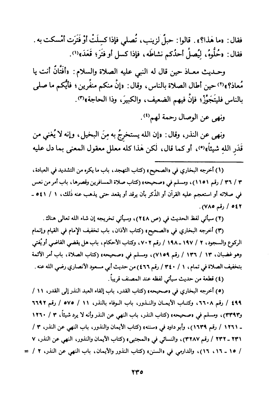 وَحَدِيثِ مُعَاذٍ حِينَ قَالَ لَهُ النَّبِيُّ عَلَيْهِ الصَّلَاةُ وَالسَّلَامُ: "أفتانٌ أَنْتَ يَا مُعَاذُ" 2 حِينَ أَطَالَ الصَّلَاةَ بِالنَّاسِ، وَقَالَ: "إِنَّ مِنْكُمْ مُنَفِّرِينَ، فَأَيُّكُمْ مَا صَلَّى بِالنَّاسِ فَلْيَتَجَوَّزْ، فَإِنَّ فِيهِمُ الضَّعِيفَ، وَالْكَبِيرَ، وَذَا الْحَاجَةِ" 3.
