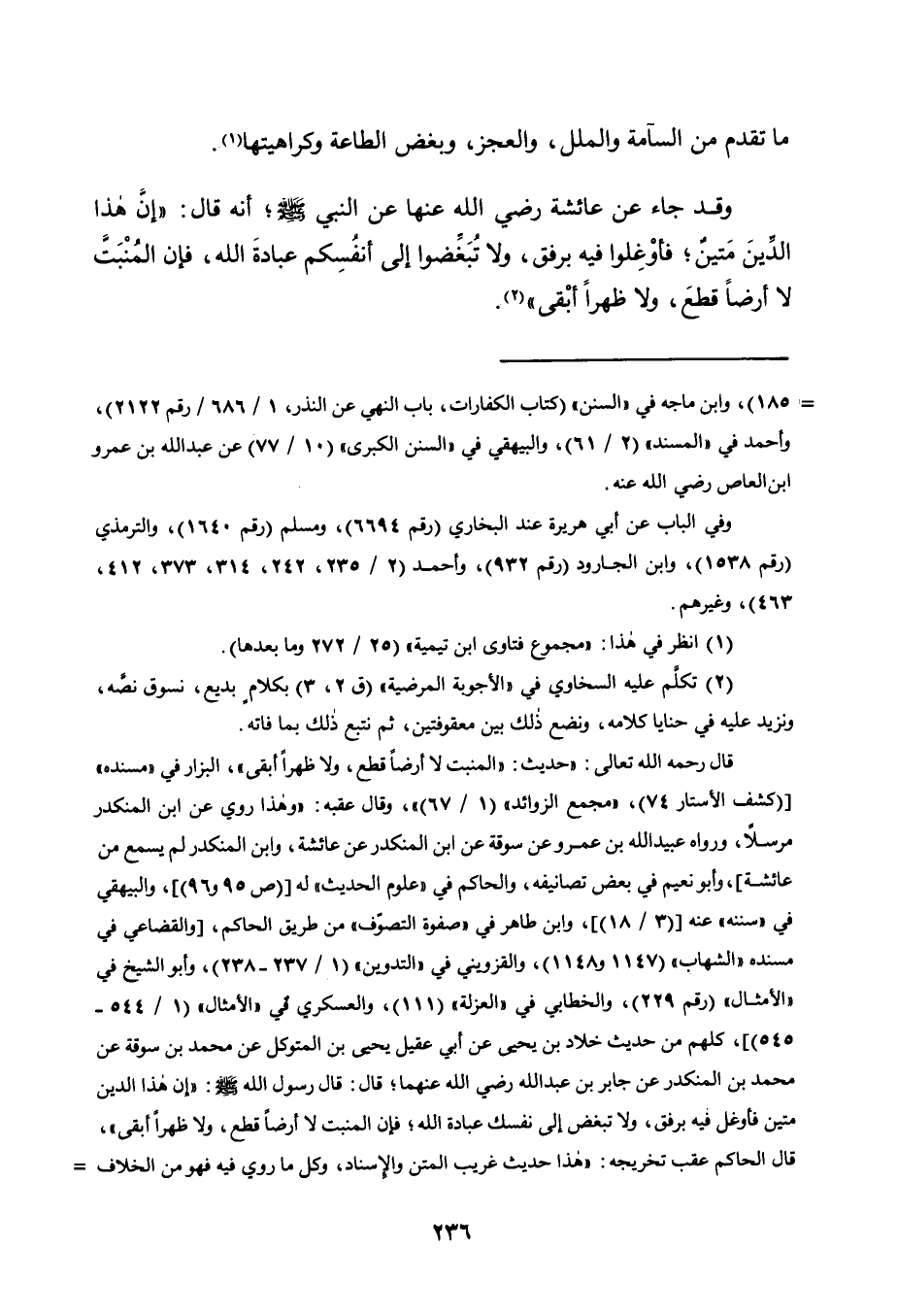 وَقَدْ جَاءَ عَنْ عَائِشَةَ رَضِيَ اللَّهُ عَنْهَا عَنِ النَّبِيِّ صَلَّى اللَّهُ عَلَيْهِ وَسَلَّمَ، أَنَّهُ قَالَ: "إِنَّ هَذَا الدِّينَ مَتِينٌ، فَأَوْغِلُوا فِيهِ بِرِفْقٍ، وَلَا تُبَغِّضُوا إِلَى أَنْفُسِكُمْ عبادةَ اللَّهِ، فَإِنَّ المُنبَتَّ لَا أرضا قطع، ولا ظهرا أبقى"2.