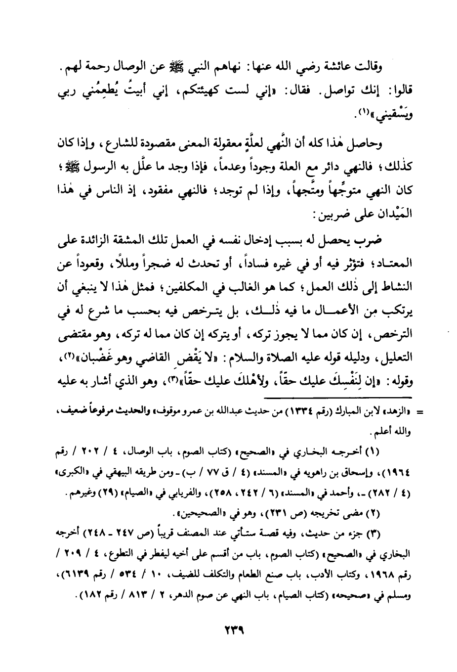 ضَرْبٌ يَحْصُلُ لَهُ بِسَبَبِ إِدْخَالِ نَفْسِهِ فِي الْعَمَلِ تِلْكَ الْمَشَقَّةُ الزَّائِدَةُ عَلَى الْمُعْتَادِ، فَتُؤَثِّرُ فِيهِ أَوْ فِي غَيْرِهِ فَسَادًا، أَوْ تُحْدِثُ لَهُ ضَجَرًا وَمَلَلًا، وَقُعُودًا عَنِ النَّشَاطِ إِلَى ذَلِكَ الْعَمَلِ، كَمَا هُوَ الْغَالِبُ فِي الْمُكَلَّفِينَ، فَمِثْلُ هَذَا لَا يَنْبَغِي أَنْ يَرْتَكِبَ مِنَ الْأَعْمَالِ مَا فِيهِ ذَلِكَ بَلْ يَتَرَخَّصُ فِيهِ بِحَسَبِ مَا شُرِعَ لَهُ فِي التَّرَخُّصِ، إِنْ كَانَ مِمَّا لَا يَجُوزُ تَرْكُهُ، أَوْ يَتْرُكُهُ إِنْ كَانَ مِمَّا لَهُ تَرْكُهُ، وَهُوَ مُقْتَضَى التَّعْلِيلِ، وَدَلِيلُهُ قَوْلُهُ عَلَيْهِ الصَّلَاةُ وَالسَّلَامُ: "لَا يقضِ الْقَاضِي وَهُوَ غَضْبَانُ" 2، وَقَوْلُهُ: "إِنَّ لِنَفْسِكَ عَلَيْكَ حَقًّا، وَلِأَهْلِكَ عَلَيْكَ حَقًّا" 3، وهو الذي أشار به عليه.