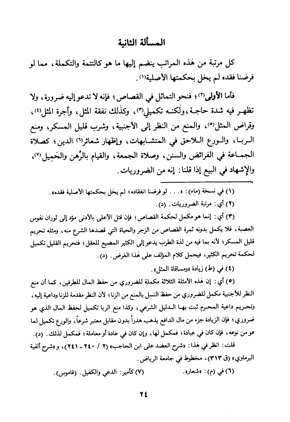 فَأَمَّا الْأُولَى2، فَنَحْوُ التَّمَاثُلِ فِي الْقِصَاصِ، فَإِنَّهُ لَا تَدْعُو إِلَيْهِ ضَرُورَةٌ، وَلَا تَظْهَرُ فِيهِ شِدَّةُ حَاجَةٍ، وَلَكِنَّهُ تَكْمِيلِيٌّ3، وَكَذَلِكَ نَفَقَةُ الْمِثْلِ، وَأُجْرَةُ الْمِثْلِ4، وَقِرَاضُ الْمِثْلِ5، وَالْمَنْعُ مِنَ النَّظَرِ إِلَى الْأَجْنَبِيَّةِ، وَشُرْبُ قَلِيلِ الْمُسْكِرِ، وَمَنْعُ الرِّبَا، وَالْوَرَعُ اللَّاحِقُ فِي الْمُتَشَابِهَاتِ، وَإِظْهَارُ شَعَائِرِ6 الدِّينِ، كَصَلَاةِ الْجَمَاعَةِ فِي الْفَرَائِضِ وَالسُّنَنِ، وَصَلَاةِ الْجُمُعَةِ، وَالْقِيَامُ بِالرَّهْنِ وَالْحَمِيلِ7، وَالْإِشْهَادُ فِي الْبَيْعِ إِذَا قلنا: إنه من الضروريات