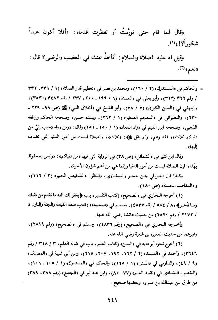 وَقَالَ لَمَّا قَامَ حَتَّى تَوَرَّمَتْ أَوْ تَفَطَّرَتْ قَدَمَاهُ: "أَفَلَا أَكُونُ عَبْدًا شَكُورًا؟! " 1.
