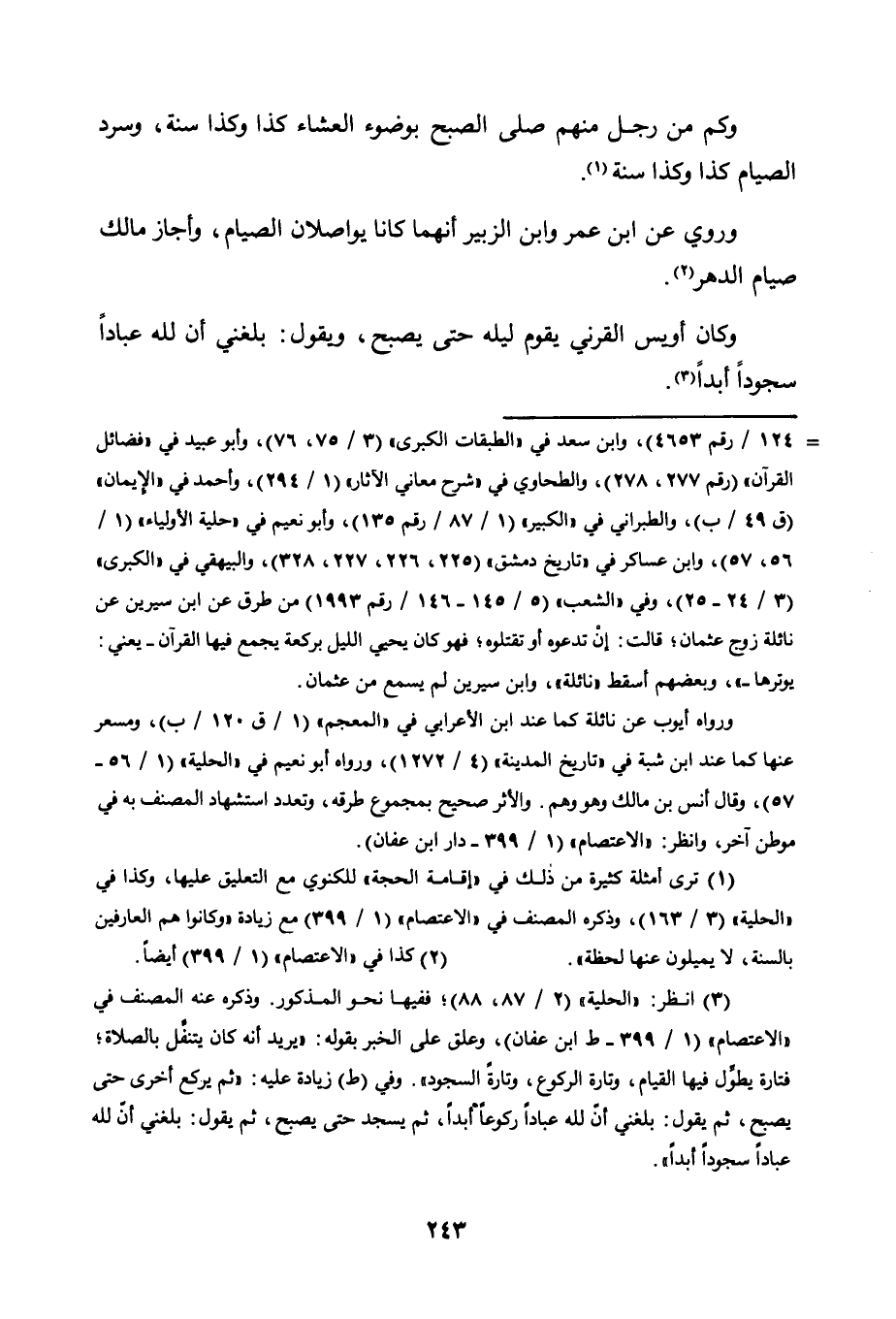 3 انظر: "الحلية" "2/ 87، 88"، ففيها نحو المذكور، وذكره عنه المصنف في "الاعتصام" "1/ 399" ط ابن عفان" وعلق على الخبر بقوله: "يريد أنه كان يتنفل بالصلاة، فتارة يطول فيها القيام، وتارة الركوع، وتارة السجود" وفي "ط" زيادة عليه: ثم يركع أخرى حتى يصبح، ثم يقول: "بلغني أن لله عبادا ركوعا أبدا" ثم يسجد حتى يصبح، ثم يقول: "بلغني ان لله عبادا سجودا أبدا".
