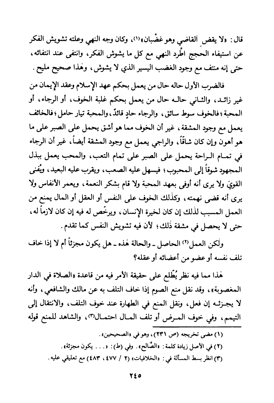 هَذَا مِمَّا فِيهِ نَظَرٌ يُطَّلَعُ عَلَى حَقِيقَةِ الْأَمْرِ فِيهِ مِنْ قَاعِدَةِ "الصَّلَاةِ فِي الدَّارِ الْمَغْصُوبَةِ" وَقَدْ نُقِلَ مَنْعُ الصَّوْمِ إِذَا خَافَ التَّلَفَ بِهِ عَنْ مَالِكٍ وَالشَّافِعِيِّ، وَأَنَّهُ لَا يُجَزِئُهُ إِنْ فَعَلَ، وَنُقِلَ الْمَنْعُ فِي الطَّهَارَةِ عِنْدَ خَوْفِ التَّلَفِ، وَالِانْتِقَالُ إِلَى التَّيَمُّمِ، وَفِي خَوْفِ الْمَرَضِ أَوْ تلف المال احتمال3، والشاهد للمنع قوله