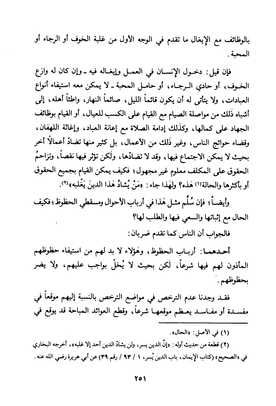 فَإِنْ قِيلَ: دُخُولُ الْإِنْسَانِ فِي الْعَمَلِ وَإِيغَالُهُ فِيهِ- وَإِنْ كَانَ لَهُ وَازِعُ الْخَوْفِ، أَوْ حَادِي الرَّجَاءِ، أَوْ حَامِلُ الْمَحَبَّةِ- لَا يُمْكِنُ مَعَهُ اسْتِيفَاءُ أَنْوَاعِ الْعِبَادَاتِ، وَلَا يَتَأَتَّى لَهُ أَنْ يَكُونَ قَائِمًا اللَّيْلَ، صَائِمًا النَّهَارَ، واطئنا أَهْلَهُ، إِلَى أَشْبَاهِ ذَلِكَ مِنْ مُوَاصَلَةِ الصِّيَامِ مَعَ الْقِيَامِ عَلَى الْكَسْبِ لِلْعِيَالِ، أَوِ الْقِيَامِ بِوَظَائِفِ الْجِهَادِ عَلَى كَمَالِهَا، وَكَذَلِكَ إِدَامَةُ الصَّلَاةِ مَعَ إِعَانَةِ الْعِبَادِ، وَإِغَاثَةِ اللَّهْفَانِ، وَقَضَاءِ حَوَائِجِ النَّاسِ، وَغَيْرِ ذَلِكَ مِنَ الْأَعْمَالِ، بَلْ كَثِيرٌ مِنْهَا تُضَادُّ أَعْمَالًا أُخَر بِحَيْثُ لَا يُمْكِنُ الِاجْتِمَاعُ فِيهَا، وَقَدْ لَا تُضَادُّهَا، وَلَكِنْ تُؤَثِّرُ فِيهَا نَقْصًا، وَتَزَاحُمُ الْحُقُوقِ عَلَى الْمُكَلَّفِ مَعْلُومٌ غَيْرُ مَجْهُولٍ، فَكَيْفَ يُمْكِنُ الْقِيَامُ بِجَمِيعِ الْحُقُوقِ أَوْ بِأَكْثَرِهَا وَالْحَالَةُ1 هَذِهِ؟ وَلِهَذَا جَاءَ: "مَنْ يُشَادَّ هَذَا الدِّينَ يَغْلِبْهُ" 2.
