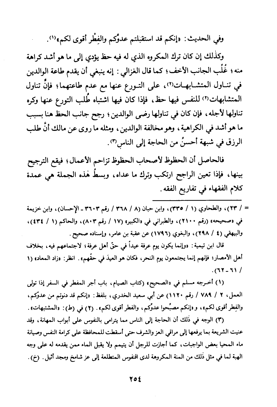 فَالْحَاصِلُ أَنَّ الْحُظُوظَ لِأَصْحَابِ الْحُظُوظِ تُزَاحِمُ الْأَعْمَالَ، فَيَقَعُ التَّرْجِيحُ بَيْنَهَا فَإِذَا تَعَيَّنَ الرَّاجِحُ ارْتُكِبَ وَتُرِكَ مَا عَدَاهُ، وَبَسْطُ هَذِهِ الْجُمْلَةِ هِيَ عُمْدَةُ كَلَامِ الْفُقَهَاءِ فِي تَفَارِيعِ الْفِقْهِ.