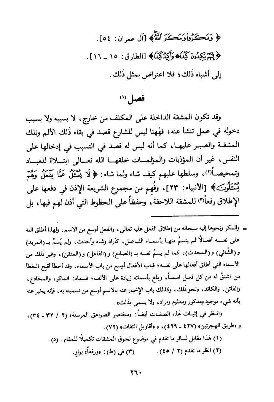 = والمكر ونحوها إليه سبحانه من إطلاق الفعل عليه تعالى، والفعل أوسع من الاسم، ولهذا أطلق الله على نفسه أفعالا لم يتسم منها بأسماء الفاعل، كأراد وشاء وأحدث، ولم يسم بـ "المريد". و"الشائي" و"المحدث"، كما لم يسم نفسه بـ "الصانع" و"الفاعل" و"المتقن"، وغير ذلك من الأسماء التي أطلق أفعالها على نفسه، فباب الأفعال أوسع من باب الأسماء، وقد أخطأ أقبح الخطأ من اشتق له من كل فعل اسما، وبلغ بأسمائه زيادة على الألف، فسماه: الماكر، والمخادع، والفاتن، والكائد، ونحو ذلك، وكذلك باب الإخبار عنه بالاسم أوسع من تسميته به، فإنه يخبر عنه بأنه شيء موجود ومذكور ومعلوم ومراد، ولا يسمى بذلك".
