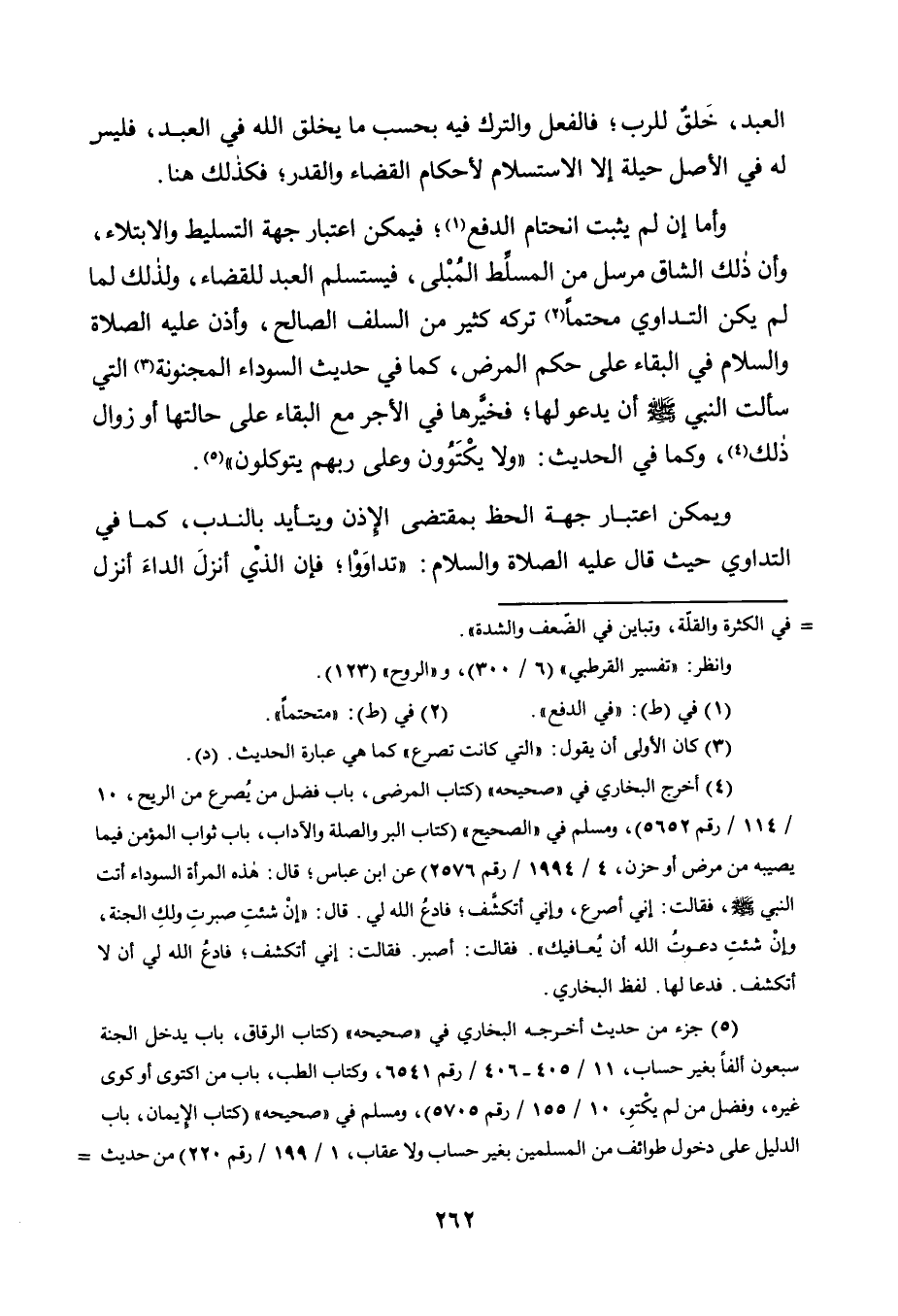 وَأَمَّا إِنْ لَمْ يَثْبُتِ انْحِتَامُ الدَّفْعِ1، فَيُمْكِنُ اعْتِبَارُ جِهَةِ التَّسْلِيطِ وَالِابْتِلَاءِ، وَأَنَّ ذَلِكَ الشَّاقَّ مُرْسَلٌ مِنَ الْمُسَلِّطِ الْمُبْلِي، فَيَسْتَسْلِمُ الْعَبْدُ لِلْقَضَاءِ، وَلِذَلِكَ لَمَّا لَمْ يَكُنِ التَّدَاوِي مُحَتَّمًا2 تَرَكَهُ كَثِيرٌ مِنَ السَّلَفِ الصَّالِحِ، وَأَذِنَ عَلَيْهِ الصَّلَاةُ وَالسَّلَامُ فِي الْبَقَاءِ عَلَى حُكْمِ الْمَرَضِ، كَمَا فِي حَدِيثِ السَّوْدَاءِ الْمَجْنُونَةِ3 الَّتِي سَأَلَتِ النَّبِيَّ صَلَّى اللَّهُ عَلَيْهِ وَسَلَّمَ أَنْ يَدْعُوَ لَهَا، فَخَيَّرَهَا فِي الْأَجْرِ مَعَ الْبَقَاءِ عَلَى حَالَتِهَا أَوْ زَوَالِ ذَلِكَ4، وَكَمَا فِي الْحَدِيثِ: "وَلَا يَكْتَوُونَ وَعَلَى رَبِّهِمْ يَتَوَكَّلُونَ" 5.