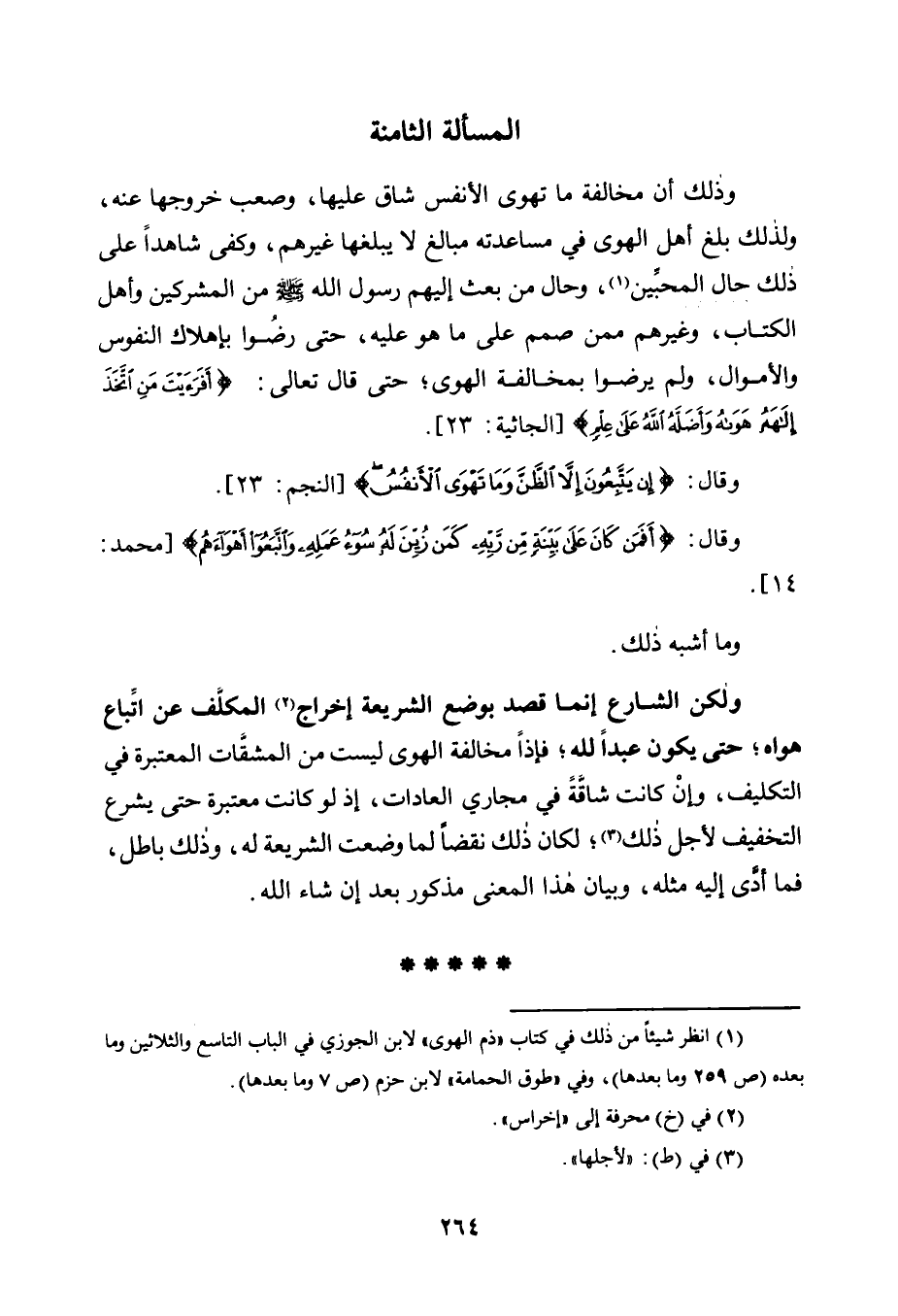 وَلَكِنَّ الشَّارِعَ إِنَّمَا قَصَدَ بِوَضْعِ الشَّرِيعَةِ إِخْرَاجَ2 الْمُكَلَّفِ عَنِ اتِّبَاعِ هَوَاهُ، حَتَّى يَكُونَ عبدًا لله، فإذن مُخَالَفَةُ الْهَوَى لَيْسَتْ مِنَ الْمَشَقَّاتِ الْمُعْتَبَرَةِ فِي التَّكْلِيفِ، وَإِنْ كَانَتْ شَاقَّةً فِي مَجَارِي الْعَادَاتِ؛ إِذْ لَوْ كَانَتْ مُعْتَبَرَةً حَتَّى يُشْرَعَ التَّخْفِيفُ لِأَجْلِ ذَلِكَ3، لَكَانَ ذَلِكَ نَقْضًا لِمَا وُضِعَتِ الشَّرِيعَةُ لَهُ، وَذَلِكَ بَاطِلٌ، فَمَا أَدَّى إِلَيْهِ مِثْلُهُ، وَبَيَانُ هَذَا الْمَعْنَى مَذْكُورٌ بَعْدُ إِنْ شاء الله.