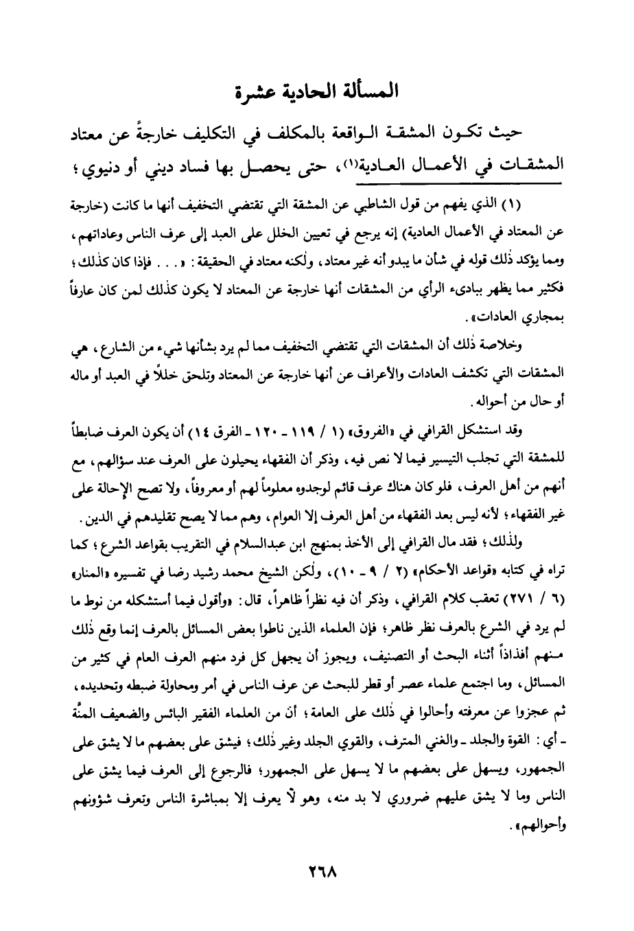 1 الذي يفهم من قول الشاطبي عن المشقة التي تقتضي التخفيف أنها ما كانت "خارجة عن المعتاد في الأعمال العادية" إنه يرجع في تعيين الخلل على العبد إلى عرف الناس وعاداتهم، ومما يؤكد ذلك قوله في شأن ما يبدو أنه غير معتاد، ولكنه معتاد في الحقيقة: " ... فإذا كان كذلك، فكثير مما يظهر ببادئ الرأي من المشقات أنها خارجة عن المعتاد لا يكون كذلك لمن كان عارفا بمجاري العادات".
