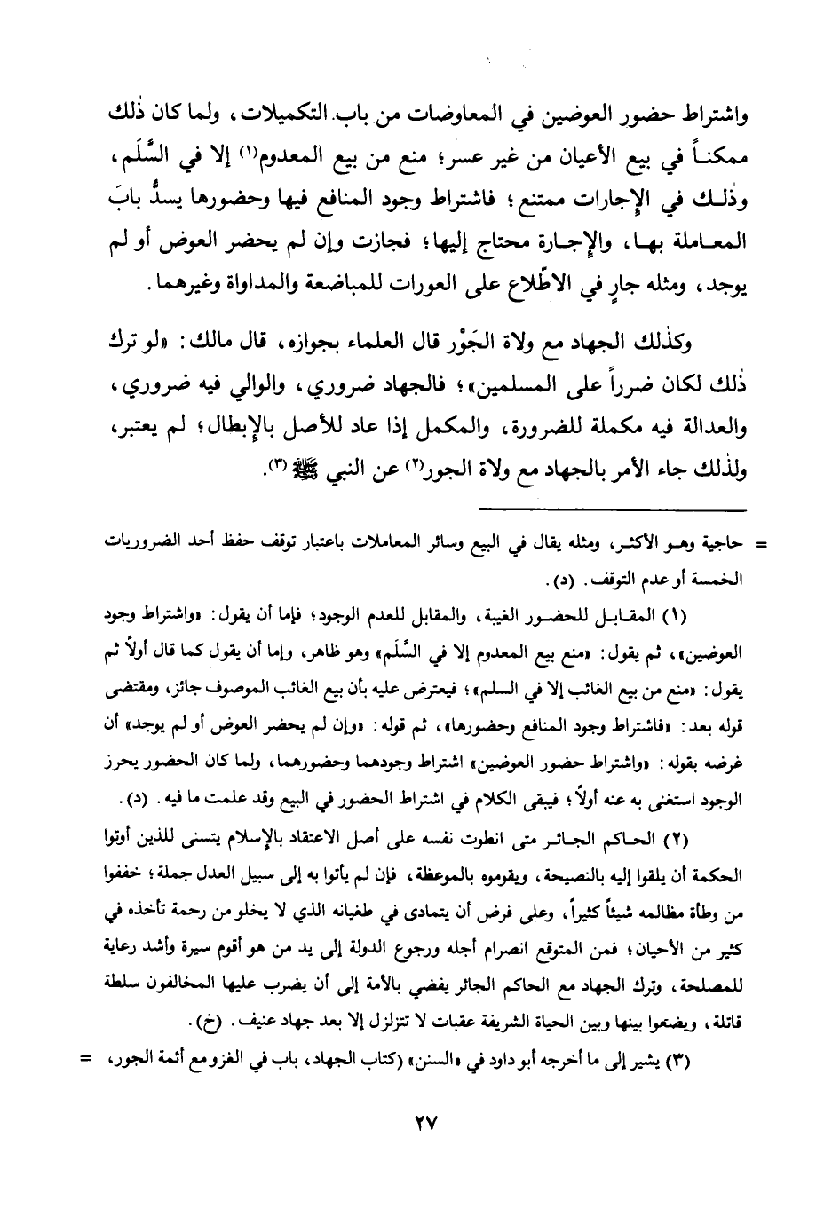 1 المقابل للحضور الغيبة، والمقابل للعدم الوجود، فإما أن يقول: "واشتراط وجود العوضين"، ثم يقول: "منع بيع المعدوم إلا في السلم" وهو ظاهر، وإما أن يقول كما قال أولا ثم يقول: "منع من بيع الغائب إلا في السلم"، فيعترض عليه بأن بيع الغائب الموصوف جائز، ومقتضى قوله بعد: "فاشتراط وجود المنافع وحضورها"، ثم قوله: "وَإِنْ لَمْ يُحْضَرِ الْعِوَضُ أَوْ لَمْ يُوجَدْ" أن غرضه بقوله: "واشتراط حضور العوضين" اشتراط وجودهما وحضورهما، ولما كان الحضور يحرز الوجود استغنى به عنه أولا، فيبقى الكلام في اشتراط الحضور في البيع وقد علمت ما فيه. "د".