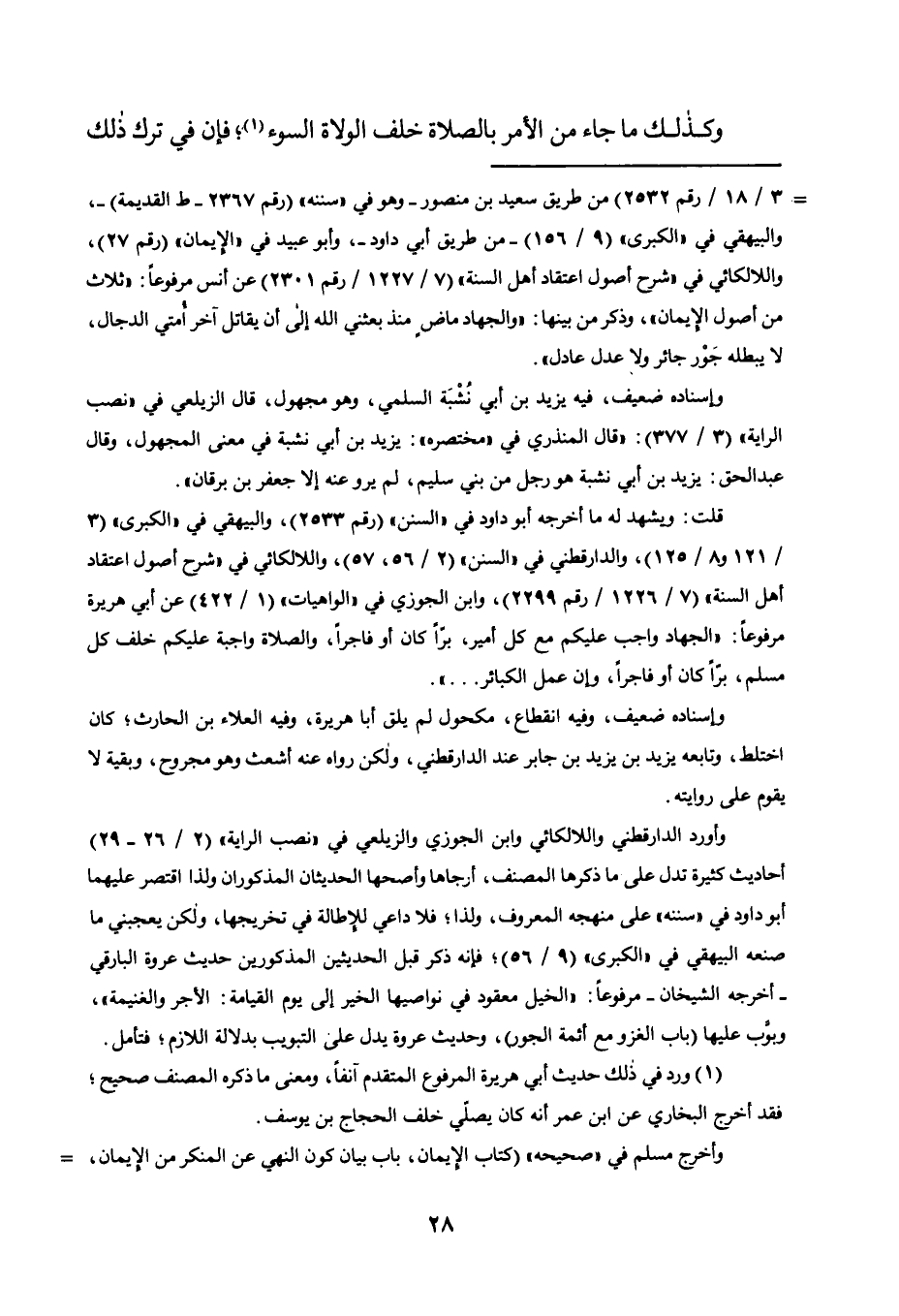 قلت: ويشهد له ما أخرجه أبو داود في "السنن" "رقم 2533"، والبيهقي في "الكبرى" "3 / 121و 8/ 125"، والدراقطني في "السنن" "2/ 56/ 57"، واللالكائي في "شرح أصول اعتقاد أهل السنة" "7/ 1226" / رقم 2299"، وابن الجوزي في "الواهيات" "1/ 422" عن أبي هريرة مرفوعا: "الجهاد واجب عليكم مع كل أمير، برا كان أو فاجرا، والصلاة واجبة عليكم خلف كل مسلم، برا كان أو فاجرا، وإن عمل الكبائر....".