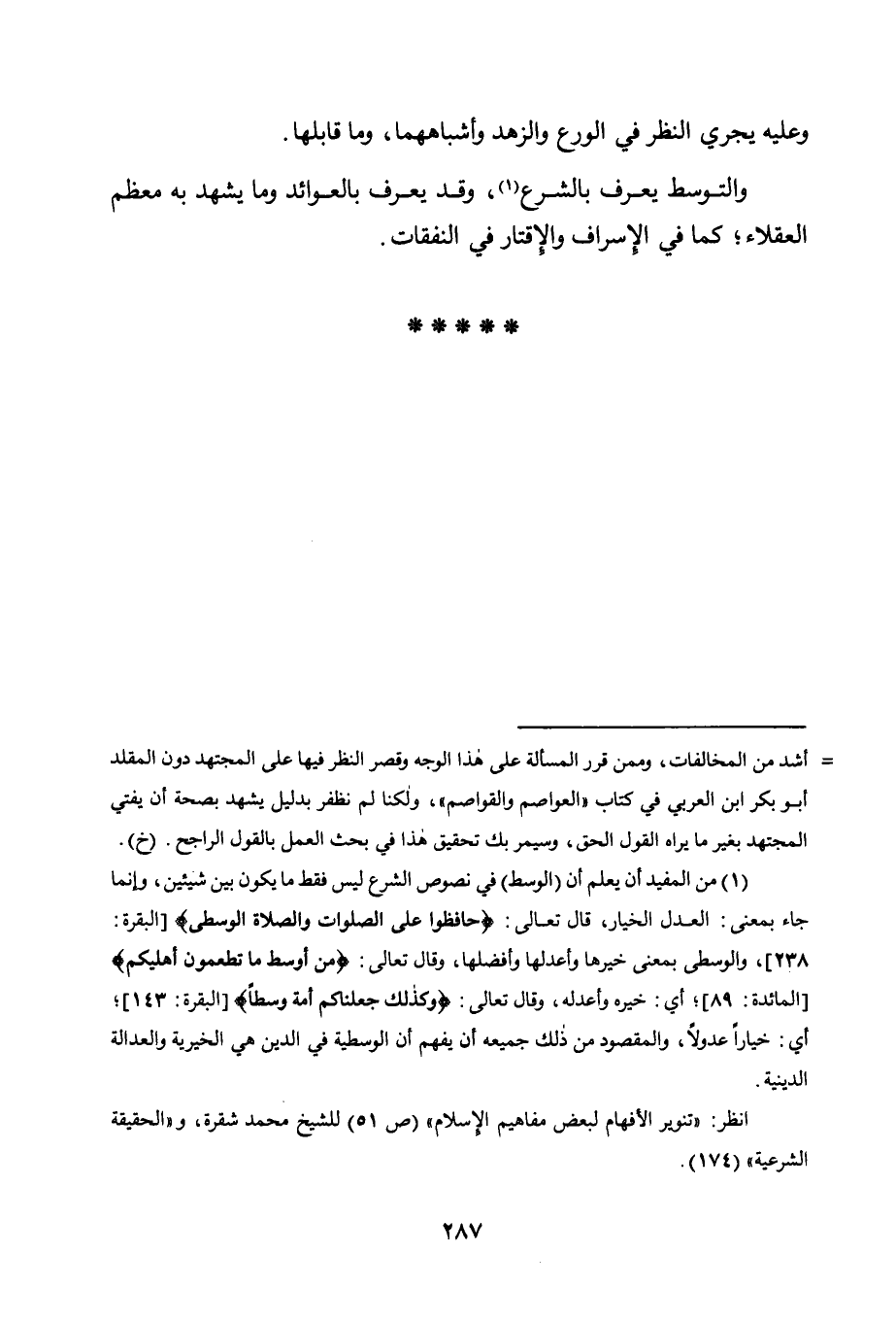 1 من المفيد أن يعلم أن "الوسط" في نصوص الشرع ليس فقط ما يكون بين شيئين، وإنما جاء بمعنى: العدل الخيار، قال تعالى: {حَافِظُوا عَلَى الصَّلَوَاتِ وَالصَّلاةِ الْوُسْطَى} [البقرة: 238] ، والوسطى بمعنى خيرها وأعدلها وأفضلها، وقال تعالى: {مِنْ أَوْسَطِ مَا تُطْعِمُونَ أَهْلِيكُمْ} [المائدة: 89] ، أي: خيره وأعدله، وقال تعالى: {وَكَذَلِكَ جَعَلْنَاكُمْ أُمَّةً وَسَطًا} [البقرة: 143] ، أي: خيارا عدولا، والمقصود من ذلك جميعه أن يفهم أن الوسطية في الدين هي الخيرية والعدالة الدينية.