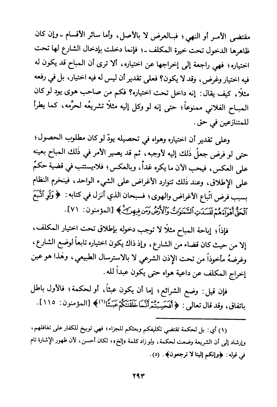 وَعَلَى تَقْدِيرِ أَنَّ اخْتِيَارَهُ وَهَوَاهُ فِي تَحْصِيلِهِ يَوَدُّ لَوْ كَانَ مَطْلُوبَ الْحُصُولِ، حَتَّى لَوْ فُرِضَ جَعْلُ ذَلِكَ إِلَيْهِ لِأَوْجَبَهُ، ثُمَّ قَدْ يَصِيرُ الْأَمْرُ فِي ذَلِكَ الْمُبَاحِ بِعَيْنِهِ عَلَى الْعَكْسِ، فَيُحِبُّ الْآنَ مَا يَكْرَهُ غَدًا، وَبِالْعَكْسِ، فَلَا يستتبُّ فِي قَضِيَّةِ حُكْمٍ عَلَى الْإِطْلَاقِ، وَعِنْدَ ذَلِكَ تَتَوَارَدُ الْأَغْرَاضُ عَلَى الشَّيْءِ الْوَاحِدِ، فَيَنْخَرِمُ النظام بسبب فرض اتِّباع الْأَغْرَاضِ وَالْهَوَى، فَسُبْحَانَ الَّذِي أَنْزَلَ فِي كِتَابِهِ: {وَلَوِ اتَّبَعَ الْحَقُّ أَهْوَاءَهُمْ لَفَسَدَتِ السَّمَاوَاتُ وَالْأَرْضُ وَمَنْ فِيهِنَّ} [المؤمنون: 71] .