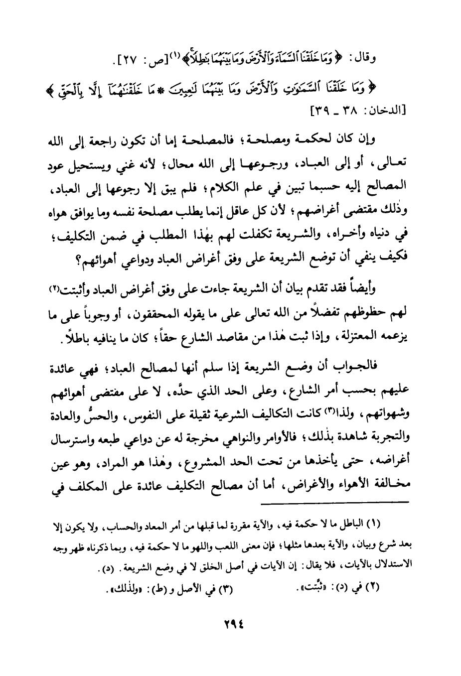 1 الباطل ما لا حكمة فيه، والآية مقررة لما قبلها من أمر المَعاد والحساب، ولا يكون إلا بعد شرع وبيان، والآية بعدها مثلها، فإن معنى اللعب واللهو ما لا حكمة فيه، وبما ذكرناه ظهر وجه الاستدلال بالآيات، فلا يقال: إن الآيات في أصل الخلق لا في وضع الشريعة. "د".