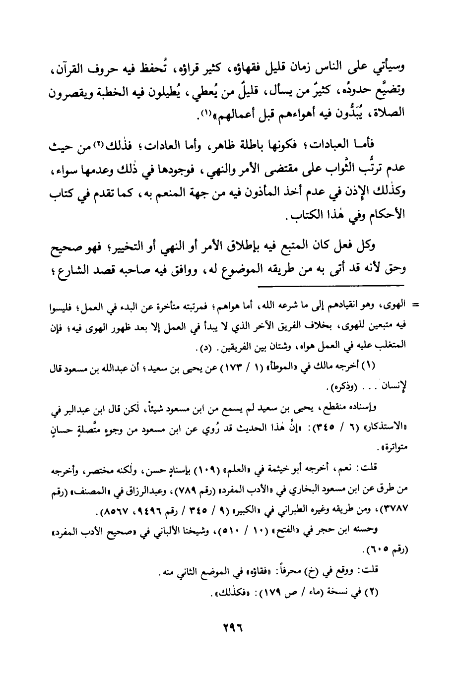 وَسَيَأْتِي عَلَى النَّاسِ زَمَانٌ قَلِيلٌ فُقَهَاؤُهُ، كَثِيرٌ قُرَّاؤُهُ، تُحْفَظُ فِيهِ حُرُوفُ الْقُرْآنِ، وَتَضِيعُ حُدُودُهُ، كَثِيرٌ مَنْ يَسْأَلُ، قَلِيلٌ مَنْ يُعْطِي، يُطِيلُونَ فِيهِ الْخُطْبَةَ وَيُقْصِرُونَ الصَّلَاةَ، يُبَدُّونَ فِيهِ أَهْوَاءَهُمْ قَبْلَ أَعْمَالِهِمْ"1.