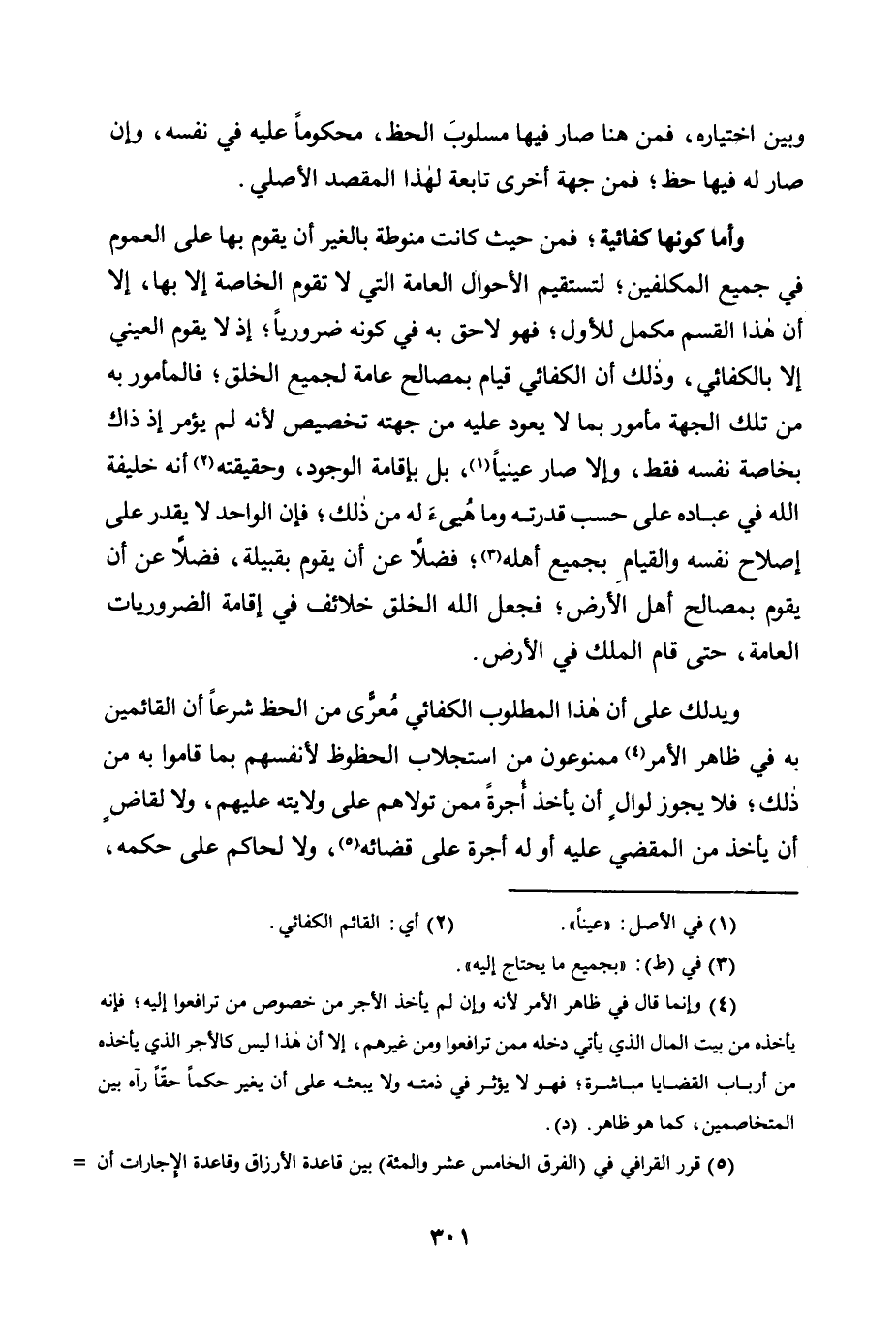 وَأَمَّا كَوْنُهَا كَفَائِيَّةً، فَمِنْ حَيْثُ كَانَتْ مَنُوطَةً بِالْغَيْرِ أَنْ يَقُومَ بِهَا عَلَى الْعُمُومِ فِي جَمِيعِ الْمُكَلَّفِينَ، لِتَسْتَقِيمَ الْأَحْوَالُ الْعَامَّةُ الَّتِي لَا تَقُومُ الْخَاصَّةُ إِلَّا بِهَا، إِلَّا أَنَّ هَذَا الْقِسْمَ مُكَمِّلٌ لِلْأَوَّلِ، فَهُوَ لَاحِقٌ بِهِ فِي كَوْنِهِ ضَرُورِيًّا؛ إِذْ لَا يَقُومُ الْعَيْنِيُّ إِلَّا بِالْكِفَائِيِّ، وَذَلِكَ أَنَّ الْكِفَائِيَّ قِيَامٌ بِمَصَالِحَ عَامَّةٍ لِجَمِيعِ الْخَلْقِ، فَالْمَأْمُورُ بِهِ مِنْ تِلْكَ الْجِهَةِ مَأْمُورٌ بِمَا لَا يَعُودُ عَلَيْهِ مِنْ جِهَتِهِ تَخْصِيصٌ لِأَنَّهُ لَمْ يُؤْمَرْ إِذْ ذَاكَ بِخَاصَّةِ نَفْسِهِ فَقَطْ، وَإِلَّا صَارَ عَيْنِيًّا1، بَلْ بِإِقَامَةِ الْوُجُودِ، وَحَقِيقَتُهُ2 أَنَّهُ خَلِيفَةُ اللَّهِ فِي عِبَادِهِ عَلَى حَسَبِ قُدْرَتِهِ وَمَا هيء لَهُ مِنْ ذَلِكَ؛ فَإِنَّ الْوَاحِدَ لَا يَقْدِرُ عَلَى إِصْلَاحِ نَفْسِهِ وَالْقِيَامِ بِجَمِيعِ أَهْلِهِ3، فَضْلًا عَنْ أَنْ يَقُومَ بِقَبِيلِةٍ، فَضْلًا عَنْ أَنْ يَقُومَ بِمَصَالِحِ أَهْلِ الْأَرْضِ، فَجَعَلَ اللَّهُ الْخَلْقَ خَلَائِفَ فِي إِقَامَةِ الضَّرُورِيَّاتِ الْعَامَّةِ، حَتَّى قَامَ الْمُلْكُ فِي الْأَرْضِ.