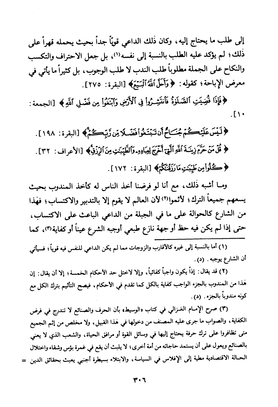 إِلَى طَلَبِ مَا يَحْتَاجُ إِلَيْهِ، وَكَانَ ذَلِكَ الدَّاعِي قَوِيًّا جِدًّا بِحَيْثُ يَحْمِلُهُ قَهْرًا عَلَى ذَلِكَ، لَمْ يُؤَكَّدْ عَلَيْهِ الطَّلَبُ بِالنِّسْبَةِ إِلَى نَفْسِهِ1، بَلْ جُعِلَ الِاحْتِرَافُ وَالتَّكَسُّبُ وَالنِّكَاحُ عَلَى الْجُمْلَةِ مَطْلُوبًا طَلَبَ النَّدْبِ لَا طَلَبَ الْوُجُوبِ، بَلْ كَثِيرًا مَا يَأْتِي فِي مَعْرِضِ الْإِبَاحَةِ، كَقَوْلِهِ: {وَأَحَلَّ اللَّهُ الْبَيْعَ} [الْبَقَرَةِ: 275] .