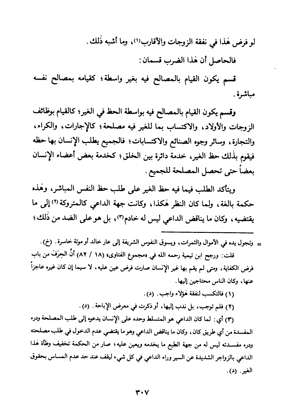 وَقِسْمٌ يَكُونُ الْقِيَامُ بِالْمَصَالِحِ فِيهِ بِوَاسِطَةِ الْحَظِّ فِي الْغَيْرِ، كَالْقِيَامِ بِوَظَائِفِ الزَّوْجَاتِ وَالْأَوْلَادِ، وَالِاكْتِسَابِ بِمَا لِلْغَيْرِ فِيهِ مَصْلَحَةٌ، كَالْإِجَارَاتِ، وَالْكِرَاءِ، وَالتِّجَارَةِ، وَسَائِرِ وُجُوهِ الصَّنَائِعِ وَالِاكْتِسَابَاتِ، فَالْجَمِيعُ يَطْلُبُ الْإِنْسَانُ بِهَا حَظَّهُ فَيَقُومُ بِذَلِكَ حَظُّ الْغَيْرِ، خِدْمَةً دَائِرَةً بَيْنَ الْخَلْقِ، كَخِدْمَةِ بَعْضِ أَعْضَاءِ الْإِنْسَانِ بَعْضًا حَتَّى تَحْصُلَ الْمَصْلَحَةُ لِلْجَمِيعِ.