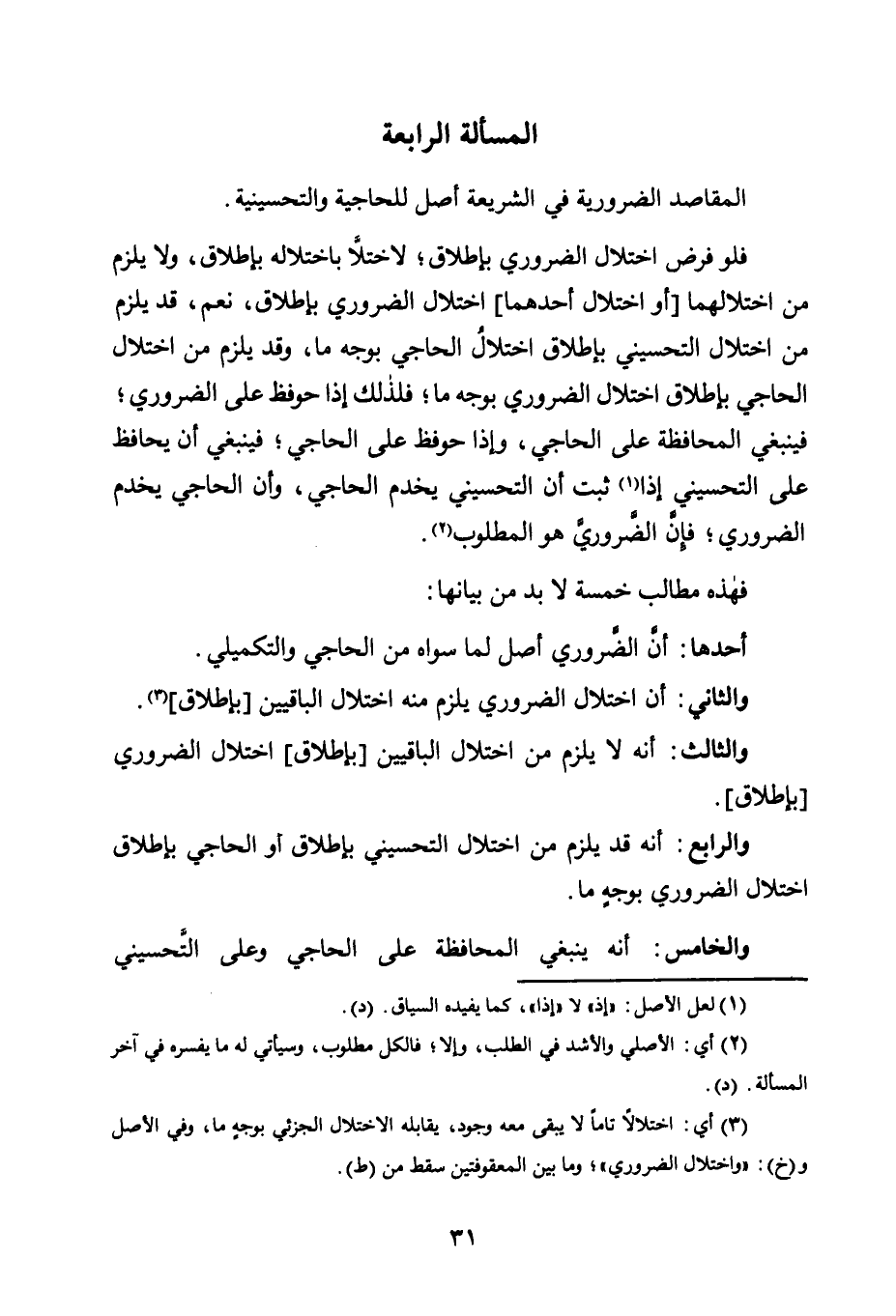 أَحَدُهَا: أَنَّ الضَّرُورِيَّ أَصْلٌ لِمَا سِوَاهُ مِنَ الْحَاجِيِّ وَالتَّكْمِيلِيِّ.