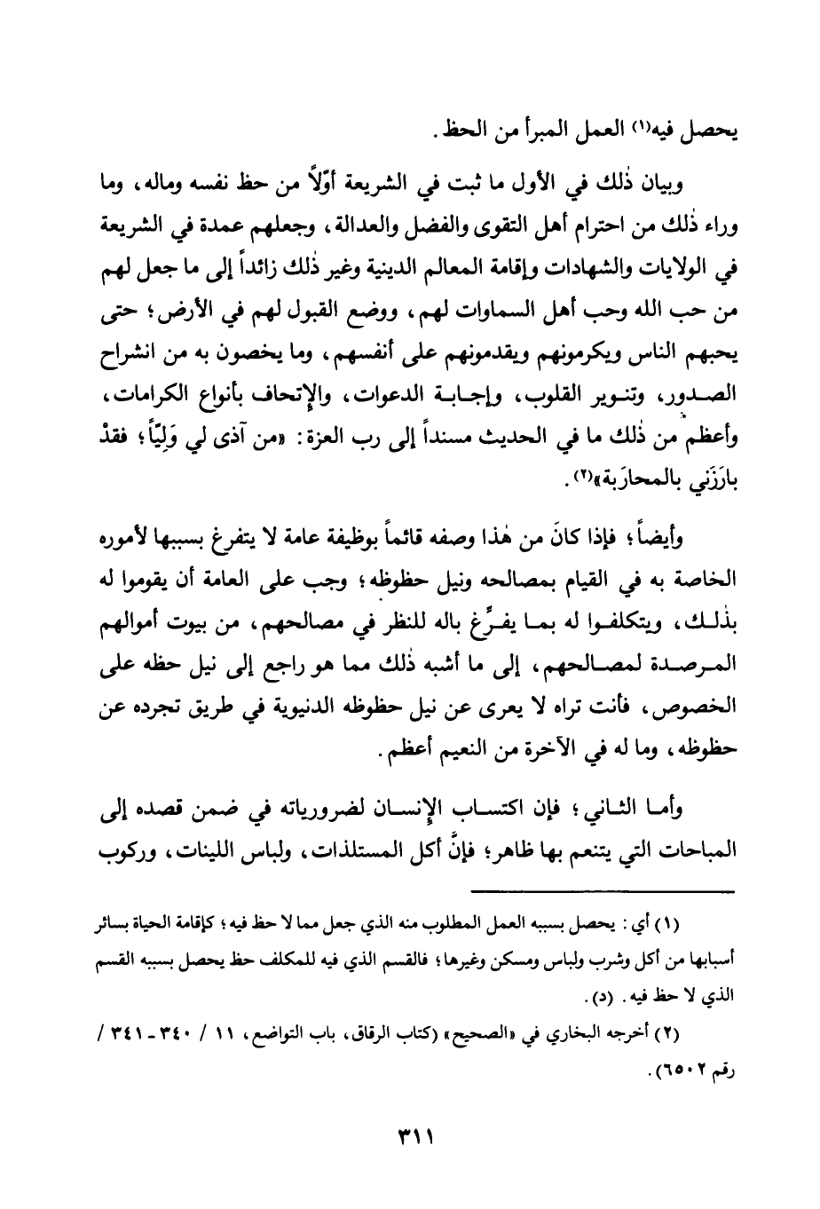 وَبَيَانُ ذَلِكَ فِي الْأَوَّلِ مَا ثَبَتَ فِي الشَّرِيعَةِ أوَّلًا مِنْ حَظِّ نَفْسِهِ وَمَالِهِ، وَمَا وَرَاءَ ذَلِكَ مِنِ احْتِرَامِ أَهْلِ التَّقْوَى وَالْفَضْلِ وَالْعَدَالَةِ، وَجَعْلِهِمْ عُمْدَةً فِي الشَّرِيعَةِ فِي الْوِلَايَاتِ وَالشَّهَادَاتِ وَإِقَامَةِ الْمَعَالِمِ الدِّينِيَّةِ وَغَيْرِ ذَلِكَ زَائِدًا إِلَى مَا جُعِلَ لَهُمْ مِنْ حُبِّ اللَّهِ وَحُبِّ أَهْلِ السَّمَاوَاتِ لَهُمْ، وَوُضِعَ الْقَبُولُ لَهُمْ فِي الْأَرْضِ، حَتَّى يُحِبَّهُمْ النَّاسُ وَيُكْرِمُونَهُمْ وَيُقَدِّمُونَهُمْ عَلَى أَنْفُسِهِمْ، وَمَا يُخَصُّونَ بِهِ مِنِ انْشِرَاحِ الصُّدُورِ، وَتَنْوِيرِ الْقُلُوبِ، وَإِجَابَةِ الدَّعَوَاتِ، وَالْإِتْحَافِ بِأَنْوَاعِ الْكَرَامَاتِ، وَأَعْظَمُ مِنْ ذَلِكَ مَا فِي الْحَدِيثِ مُسْنَدًا إِلَى رَبِّ الْعِزَّةِ: "مَنْ آذَى لِي وَلِيًّا، فَقَدْ بَارَزَنِي بِالْمُحَارِبَةِ" 2.