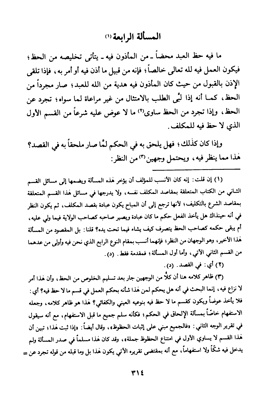 1 إن قلت: إنه كان الأنسب للمؤلف أن يؤخر هذه المسألة ويضمها إلى مسائل القسم الثاني من الكتاب المتعلقة بمقاصد المكلف نفسه، ولا يدرجها في مسائل هذا القسم المتعلقة بمقاصد الشرع بالتكليف؛ لأنها ترجع إلى أن المباح يكون عبادة بقصد المكلف، ثم يكون النظر في أنه حينذاك هل يأخذ الفعل حكم ما كان عبادة ويصير صاحبه كصاحب الولاية فيما ولي عليه، أم يبقى حكمه كصاحب الحظ يتصرف كيف يشاء فيما تحت يده؟ قلنا: بل المقصود من المسألة هذا الأخير، وهو الوجهان من النظر، فإنهما أنسب بمقام النوع الرابع الذي نحن فيه وأولى من عدهما من القسم الثاني الآتي، وأما أول المسألة، فمقدمة فقط. "د".