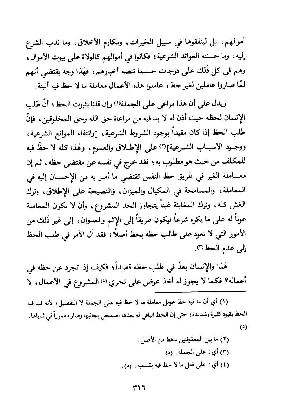 وَيَدُلُّ عَلَى أَنَّ هَذَا مُرَاعًى عَلَى الْجُمْلَةِ1 وَإِنْ قُلْنَا بِثُبُوتِ الْحَظِّ، أَنَّ طَلَبَ الْإِنْسَانِ لِحَظِّهِ حَيْثُ أُذِنَ لَهُ لَا بُدَّ فِيهِ مِنْ مُرَاعَاةِ حَقِّ اللَّهِ وَحَقِّ الْمَخْلُوقِينَ، فإن طلب الحظ إِذَا كَانَ مُقَيَّدًا بِوُجُودِ الشُّرُوطِ الشَّرْعِيَّةِ، [وَانْتِفَاءِ الْمَوَانِعِ الشَّرْعِيَّةِ، وَوُجُودِ الْأَسْبَابِ الشَّرْعِيَّةِ] 2 عَلَى الْإِطْلَاقِ وَالْعُمُومِ، وَهَذَا كُلُّهُ لَا حَظَّ فِيهِ لِلْمُكَلَّفِ مِنْ حَيْثُ هُوَ مَطْلُوبٌ بِهِ، فَقَدْ خَرَجَ فِي نَفْسِهِ عَنْ مُقْتَضَى حَظِّهِ، ثُمَّ إِنَّ مُعَامَلَةَ الْغَيْرِ فِي طَرِيقِ حَظِّ النَّفْسِ تَقْتَضِي مَا أُمِرَ بِهِ مِنَ الْإِحْسَانِ إِلَيْهِ فِي الْمُعَامَلَةِ، وَالْمُسَامَحَةِ فِي الْمِكْيَالِ وَالْمِيزَانِ، وَالنَّصِيحَةِ عَلَى الْإِطْلَاقِ، وَتَرْكِ الْغِشِّ كُلِّهِ، وَتَرْكِ الْمُغَابَنَةِ غَبْنًا يتجاوز الحد المشروع، وأن لا تكون العاملة عَوْنًا لَهُ عَلَى مَا يُكْرَهُ شَرْعًا، فَيَكُونُ طَرِيقًا إِلَى الْإِثْمِ وَالْعُدْوَانِ، إِلَى غَيْرِ ذَلِكَ مِنَ الْأُمُورِ الَّتِي لَا تَعُودُ عَلَى طَالِبِ حَظِّهِ بِحَظٍّ أَصْلًا، فَقَدْ آلَ الْأَمْرُ فِي طَلَبِ الْحَظِّ إِلَى عَدَمِ الْحَظِّ3.